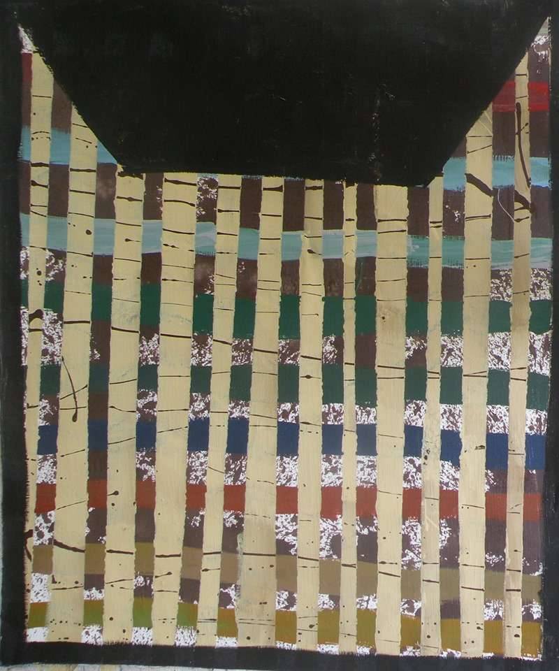 Obraz przedstawia abstrakcyjne formy, które na pierwszy rzut oka mogą przypominać płot lub ogrodzenie. Dominują tu pionowe pasy w kolorach bursztynowych, brązowych i zielonych, które tworzą rytmiczny wzór. Ciemne tło kontrastuje z jasnymi elementami, dodając głębi i tajemniczości. Kompozycja jest zaskakująca, bo dolna część obrazu jest bardziej dynamiczna, z dodatkiem czerwieni i niebieskiego, co nadaje dziełu pewien flow. Atmosfera na obrazie jest dość enigmatyczna, może nawet lekko niepokojąca. Jakbyśmy podglądali coś z ukrycia. Technika artystyczna sugeruje podejście bardziej surowe, być może z wpływami sztuki naiwnej czy ludowej. Można tu dostrzec niedoskonałości i celową prostotę wykonania, która podkreśla naturalność dzieła. Czy patrząc na taki obraz, można poczuć spokój? A może wręcz przeciwnie, odrobinkę chaosu? Każde spojrzenie może wywoływać różne emocje, takie jak nostalgia czy tęsknota za prostotą. For real, warto czasem popatrzeć z perspektywy dziecka. Jak patrzę na to, myślę o wakacjach na wsi. "Ooo, to wygląda jak drewniany ganek, na którym bawiłem się latem!" mówi mały głos z przeszłości. Obraz, choć nieskomplikowany, skłania do refleksji nad prostymi formami i ich miejscem w naszym skomplikowanym świecie. Połączenia kolorów i kształtów mogą sprawić, że poczujemy się jak w podróży między znanym a nieznanym.