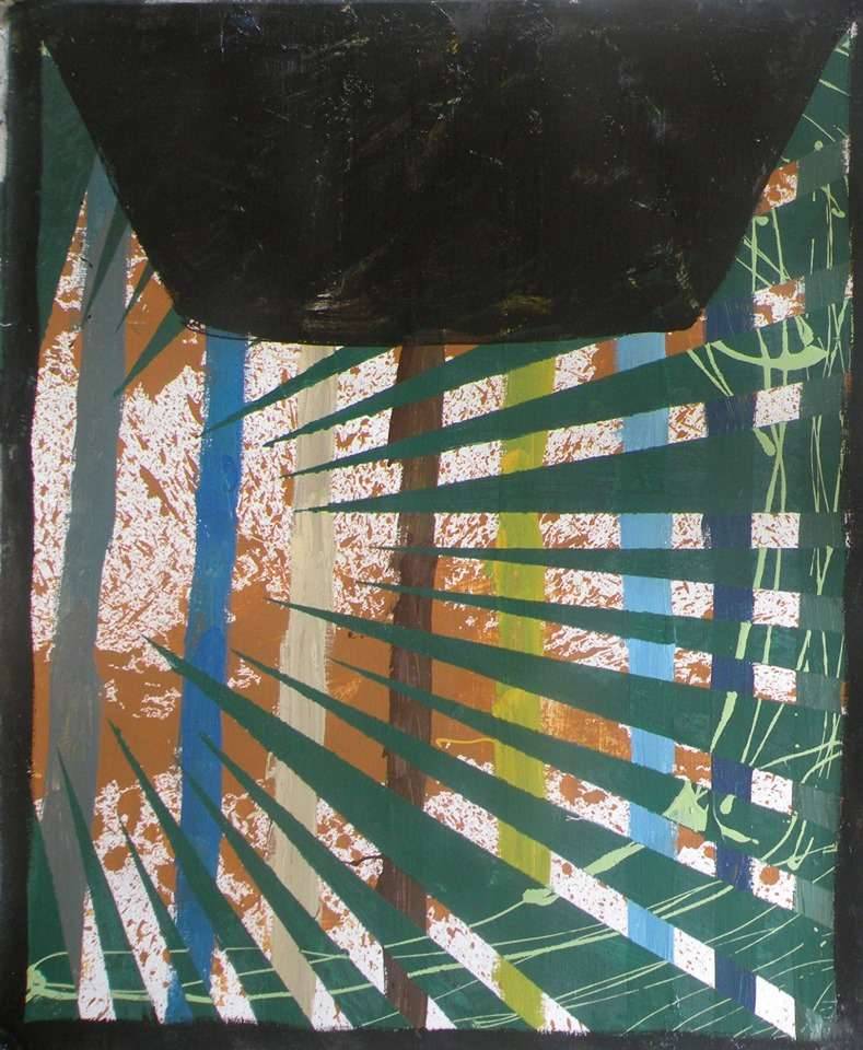 Na obrazie widzimy dynamiczną kompozycję pełną kontrastujących kolorów. Czarny, prostokątny kształt dominuje w górnej części, tworząc dramatyczne tło dla wybuchu barwnych pasów wychodzących z dołu. Te paski, w odcieniach zieleni, błękitu, brązów i bieli, rozchodzą się jak promienie słońca, nadając całości strukturę i rytm. Tworzy to efekt optyczny, który niemal wciąga widza do środka obrazu. Jakby patrzeć przez szczeliny do innego, tajemniczego świata! Atmosfera jest pełna napięcia i energii, jakby coś ważnego zaraz miało się wydarzyć. Użycie lin i płaskich barw przywodzi na myśl estetykę abstract art, gdzie forma i kolor są kluczowe. Technika artysty zdaje się łączyć agresywne pociągnięcia pędzlem z precyzyjnym planowaniem kompozycji, co tworzy ciekawą, almost electric mieszankę. Patrząc na to dzieło, można poczuć fascynację i pewien niepokój. To trochę jak szukanie porządku w chaosie. Look, mamo, to jak rakieta startująca w kosmos! Taki obraz potrafi wywołać uśmiech, ale też zadumę nad tym, jakie znaczenie nosi w swoim sercu. Magiczna podróż dla oczu – taki mały ukłon w stronę tego, co niewidzialne, ale odczuwalne.