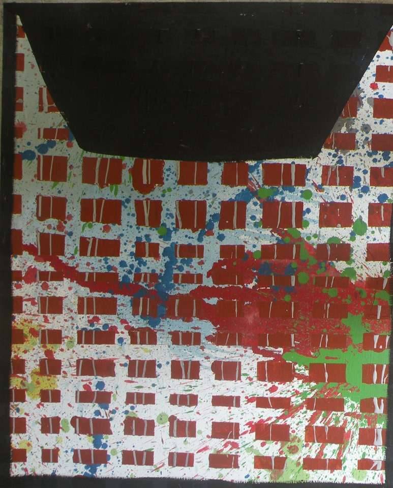 Na obrazie widzimy dynamiczną kompozycję pełną kontrastów. Tło wypełniają białe i czerwone prostokąty, które tworzą powtarzający się wzór, niczym siatka. Na to nachodzą dynamiczne plamy w kolorach zielonym, niebieskim i czarnym. Te spontaniczne kształty dodają obrazowi energii i chaosu. Duża czarna płaszczyzna na gorze dominuje nad resztą, kontrastując z pozoru regularnym wzorem poniżej. Obraz emanuje poczuciem niepokoju, jakby coś regularnego zostało nagle zaburzone przez przypadek. Artysta zdaje się korzystać z technik action painting, gdzie spontaniczność i emocje mają pierwszeństwo. Szczęśliwie wylane farby tworzą efekt wybuchowej ekspresji. Chyba trochę jak wtedy, kiedy wylewa się sok z kartonu na podłogę. Widz odczuwa intensywność oraz nieprzewidywalność, co budzi ciekawość, a czasami nawet lekki niepokój. Można sobie wyobrazić, że artysta chciał uchwycić moment zatrzymania chaosu w ryzach struktury. That's the point. Obraz skłania do refleksji nad równowagą między porządkiem a nieładem, co jest bliskie wielu codziennym sytuacjom. Dobrze by było mieć takie dzieło w swoim pokoju, prawda? Wciąga i prowokuje do myślenia.