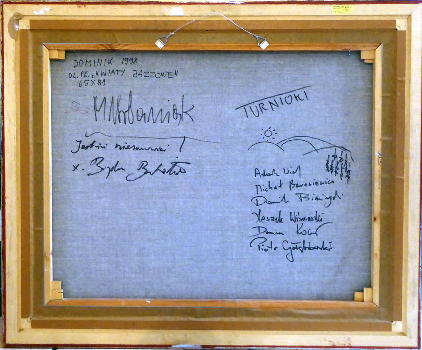 Z tyłu obrazu znajdują się podpisy artystów związanych z Jazzem - Michała Urbaniaka oraz członków zespołu "Turnioki