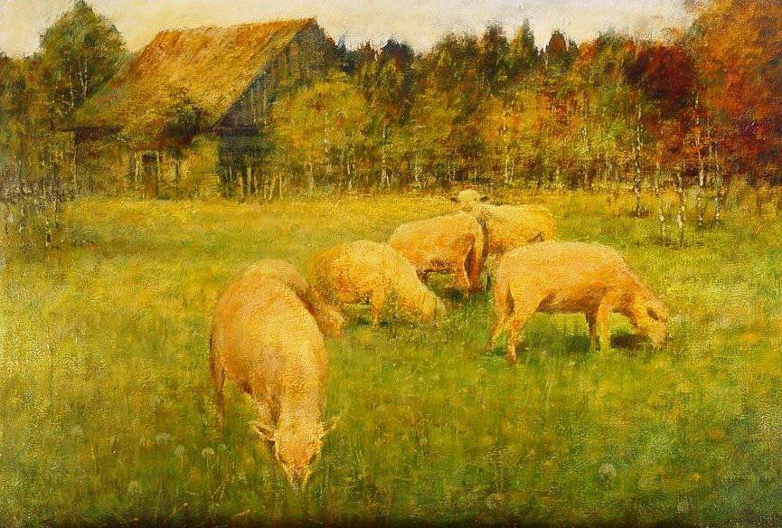Obraz przedstawia malowniczą scenę, gdzie pięć owiec spokojnie pasie się na soczysto zielonej łące. Towarzyszy im radosna, beztroska atmosfera, jakby świat poza nimi nie istniał. W tle rozpościera się las drzew przeplatanych odcieniami żółci i brązu, co dodaje obrazowi jesiennego, ciepłego nastroju. Stara, drewniana chałupa wyłania się zza drzew, wnosząc element nostalgii. Kolorystyka jest jakby lekko przydymiona, co nadaje dziełu wrażenie, jakbyśmy patrzyli przez filtr przeszłości. Artysta zastosował delikatne pociągnięcia pędzla, tworząc gładkie przejścia między kolorami. To nadaje obrazowi miękkość i łagodność. Może wywoływać spokój, a czasem nawet tęsknotę za prostym życiem na wsi. Look at these sheep, they're so fluffy! To mogłoby powiedzieć dziecko, wskazując na puchate owce. Uroczy krajobraz skłania do refleksji, pozwala choć na chwilę oderwać się od codzienności. Patrząc na ten obraz, można poczuć, jak czas zwalnia i wszystko wokół nabiera magicznego uroku.
