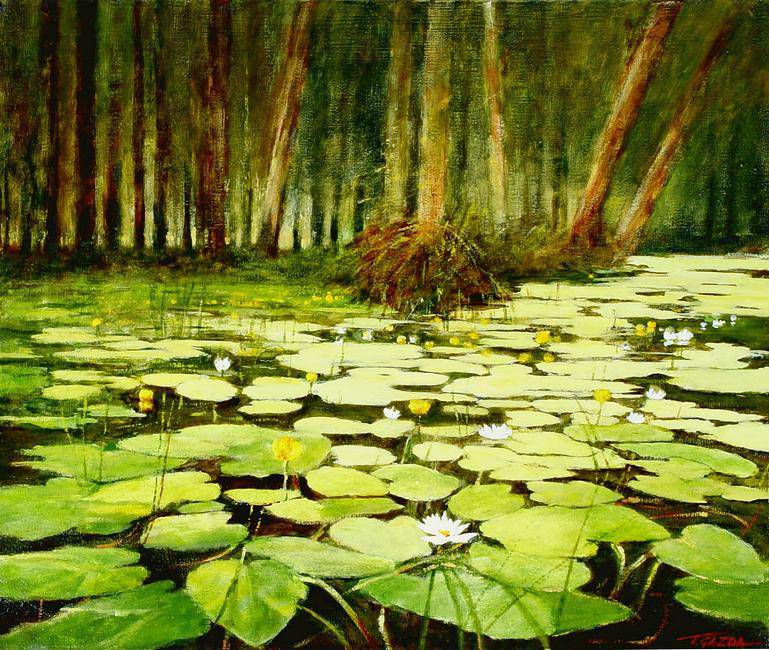 Obraz tchnie spokojem i tajemniczością, jakby czas na chwilę się zatrzymał. Dominują tutaj zielenie i brązy, przeplatające się w harmonijną mozaikę liści i drzew. Woda jest jak lustro, w której pływają lilie wodne – ich białe i żółte kwiaty przyciągają wzrok niczym drobne klejnoty na tafli. Drzewa w tle są smukłe i wysokie, tworzą gęsty las, w którym każdy cień skrywa jakąś opowieść. Atmosfera tego miejsca jest spokojna, aż chce się tam być i słuchać śpiewu ptaków. Styl malarza jest trochę impresjonistyczny, z wyraźnym pociągnięciem pędzla – można niemal poczuć, jakby liście się poruszyły pod dotykiem wiatru. Coś niezwykle magicznego jest w tej prostocie, a jednak – dzięki kolorom i kompozycji – obraz ma mocny impact. Wywołuje u mnie nostalgiczną tęsknotę za dzieciństwem i letnimi dniami nad jeziorem. Patrząc na niego, człowiek chce zamknąć oczy i przenieść się do tego świata, do zapachu lasu i szumu wody. Nawet small frog mógłby tam siedzieć spokojnie. Nie mogę oderwać wzroku od tego zapierającego dech w piersiach krajobrazu. Czuję, jakby praca artysty była hołdem dla natury, która zawsze potrafi zaskakiwać swoją prostotą i pięknem.
