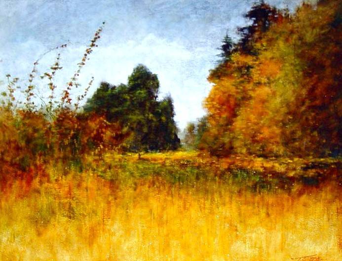 Obraz przedstawia urokliwy krajobraz pełen jesiennego blasku. Dominują ciepłe odcienie złota i pomarańczy, które kontrastują z ciemną zielenią drzew na horyzoncie. Kompozycja jest harmonijna, a linia horyzontu delikatnie dzieli płótno, nadając równowagę. Atmosfera emanuje spokojem i nostalgią za odchodzącym latem. Artysta zastosował technikę impresjonistyczną, z widocznymi pociągnięciami pędzla, które dodają głębi i dynamiki. Patrzysz na ten obraz i aż czujesz powiew chłodnego, jesiennego wiatru. Przyjemne ciepło barw otula niczym cozy koc w zimne dni. Dzieło wywołuje uczucie zadumy i tęsknoty za prostotą chwil spędzonych na łonie natury. Techniki artystyczne, których użył twórca, nadają mu niemal magiczny charakter. Myślisz sobie: „Kurczę, chciałbym tam być!” A co by tu powiedziało dziecko? „Mamo, to wygląda jak z bajki!”. Taka jest właśnie magia sztuki. Jest trochę nieprzewidywalna, a jednak przyjemna w swej chaotycznej harmonii. Sprawia, że na chwilę świat dokoła przestaje się liczyć.