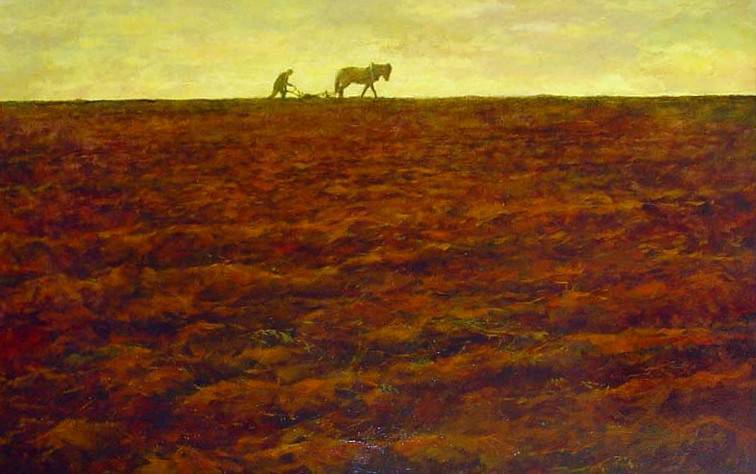 Na tym obrazie dominują ciepłe, ziemiste kolory. Przestrzeń pokryta jest brązowymi odcieniami, które przeplatają się z zieleniną i akcentami żółci. Horyzont jest niemal niezauważalny, przysłonięty delikatnym światłem, które delikatnie oświetla sylwetkę konia i człowieka. Kompozycja skupia się na prostocie – postaci są umieszczone na tle rozległej, płaskiej ziemi, co podkreśla ogrom i samotność przestrzeni. Obraz emanuje spokojem i melancholią. Mimo prostoty, wzbudza on głębokie refleksje nad trudem codziennego życia. Styl artystyczny zdradza wpływy realizmu, z subtelnymi muśnięciami pędzla. Powierzchnia wygląda, jakby artysta używał impasto, co nadaje obrazowi teksturę. Dla dziecka to po prostu koń na polu. Może przywoływać uczucie nostalgia, spokoju, a jednocześnie skłaniać do przemyśleń o naturze ludzkiego życia. Widać tu echo słowa "endurance", bo obraz ukazuje trwający wysiłek. Refleksje na temat ciszy i ciężkiej pracy nasuwają się same, bowiem widz odczuwa pewną bliskość z pracującymi w polu, mimo dystansu dzielącego ich od widza. Kiedy patrzę, czuję jakby czas się zatrzymał.