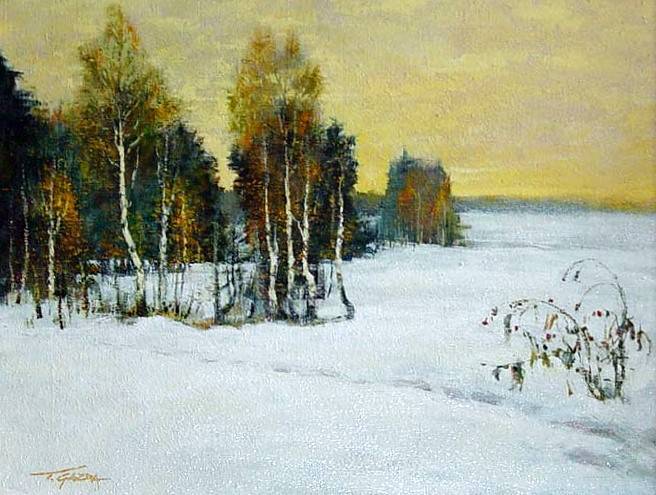 Na tym urokliwym obrazie widać spokojny zimowy krajobraz. Dominują tu zimne, spokojne barwy. Białe połacie śniegu kontrastują z ciemnymi sylwetkami drzew, pokrytymi gęstym, ciemnozielonym igliwiem. Rozproszone na niebie żółto-pomarańczowe światło sugeruje zachód słońca, dodając scenie ciepła mimo chłodu otoczenia. Kompozycja jest wyważona, z linią horyzontu delikatnie opadającą na prawo. Atmosfera obrazu jest nostalgic, skłaniająca do refleksji, przypominającą o cichej, spokojnej zimie na wsi. Artysta zastosował technikę impastu, co widać w fakturze pociągnięć pędzla, głównie na śniegu i liściach drzew. Czuje się tu spokój, ale jednocześnie jakąś niewysłowioną tajemnicę. Słuchając szelestu liści, można niemalże poczuć jak mróz szczypie w nos. Obraz wywołuje poczucie tęsknoty za prostotą i naturalnym pięknem, które często umyka w codziennym pędzie. Dla 7-letniego dziecka, scena ta mogłaby przypominać bajkę, w której słońce i śnieg to najlepsi przyjaciele. Ten obraz jest jak cichutki szept lasu. Wow, jak tam musi być pięknie! Overall, dzieło to odzwierciedla idealną harmonię natury, ukazując jej surowe piękno z łagodnością, a emocje, jakie niesie, są jak miękki koc w zimowy wieczór.