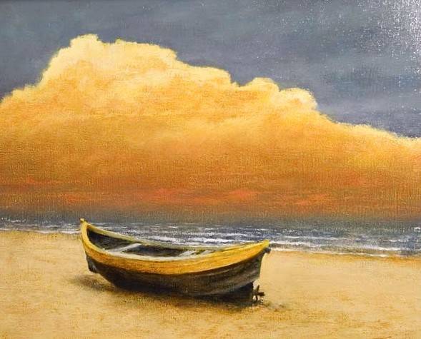 Na obrazie widzimy samotną łódkę, spoczywającą na piaszczystym brzegu. Jej smukła sylwetka maluje się na tle ogromnego złoto-pomarańczowego obłoku, który dominuje na niemal całym niebie. To jakby obłok zamierzał pochłonąć nieboskłon swoim majestatem. Kolory są ciepłe, a kontrast między intensywną barwą chmur a ciemnym, schłodzonym morzem tworzy napięcie. Łódka jest pokryta pastelowym, nieco zblakłym żółto-szarym odcieniem, co dodaje obrazowi nostalgii i może nawet smutku. Obraz wywołuje uczucie spokoju, ale jednocześnie jakiegoś niepokoju – jakby coś się miało wydarzyć. Czy to burza na horyzoncie, czy po prostu zachód słońca? Never mind, to pozostaje tajemnicą artysty. Technika, którą zastosowano, łączy w sobie delikatne pociągnięcia pędzlem z bardziej zdecydowanymi mazami, co dodaje tekstury i głębi. Obserwując ten obraz, można poczuć tęsknotę za czymś, co już było lub jeszcze nadejdzie. Dla niektórych to medytacja, dla innych melancholia. A może marzenie o przygodzie na spokojnym morzu? Łódka zdaje się opowiadać historię, czeka, może nawet na Ciebie. Mój młodszy brat powiedziałby, że łódka wygląda jakby chciała popłynąć na chmurkę. Zachwycająca gra świateł i cieni wciąga w świat, gdzie czas jakby na chwilę się zatrzymał.