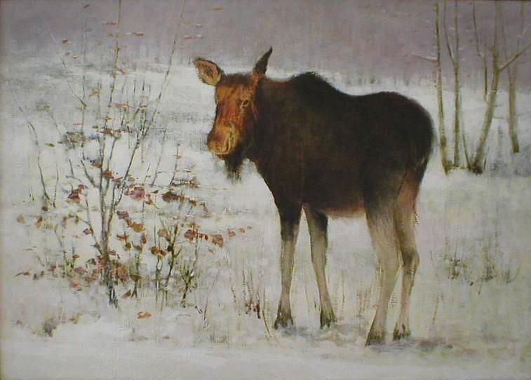 Na obrazie widzimy majestatycznego łosia, który stoi na tle zimowego krajobrazu. Kolory są stonowane, dominują chłodne odcienie szarości i bieli, z delikatnymi akcentami brązu na sierści zwierzęcia. Kompozycja jest prosta, ale jednocześnie bardzo wymowna. Łoś umiejscowiony jest na pierwszym planie, a za nim rozciąga się mglista przestrzeń pełna śniegu i nagich drzew. Atmosfera obrazu jest spokojna i tajemnicza. Czuć w niej chłód zimowego poranka, ale też niezwykły spokój naturalnego świata. Artysta posłużył się technikami olejnymi, co daje obrazowi miękkość i subtelność. Pociągnięcia pędzla są delikatne, ale jednocześnie precyzyjne, co pozwala uchwycić szczegóły takie jak puszyste futro łosia. Styl jest realistyczny, jednak posiada ten magic touch, który nadaje obrazowi nieco baśniowy charakter. Patrząc na ten obraz, czujesz jakby czas na chwilę się zatrzymał. Łoś wydaje się być strażnikiem tego zimowego królestwa, emanując spokojem i siłą. To jest jak sen, w którym dzieci biegają po śniegu. Ten obraz może wywołać u odbiorcy uczucie zadumy nad pięknem natury. Ja patrzę i czuję ten magiczny "chill". Zachwyca surowość przyrody i prostota, która zawsze skrywa głębsze treści. Każdy może znaleźć w nim własne odbicie, własną historię. Takie obrazy są jak ciche śpiewy zimy, które unoszą się w powietrzu.