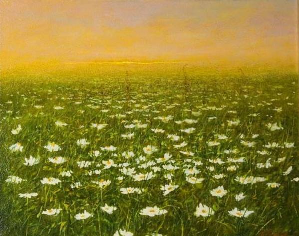 Na obrazie rozciąga się nieskończona łąka, pokryta białymi kwiatami, kojarzącymi się z lekkością i czystością. Zieleń trawy płynnie łączy się z żółtym, niemal pomarańczowym niebem, które przywodzi na myśl ciepły zachód słońca. Kompozycja jest prosta, choć niezwykle sugestywna. Kwiaty zdają się tańczyć na wietrze, wywołując wrażenie spokoju i harmonii. Atmosfera emanująca z obrazu jest głęboko relaksująca, idealna na chwilę refleksji. Artysta używa subtelnych pociągnięć pędzla, co dodaje dziełu delikatności. Technika, jaką zastosowano, może przypominać impresjonizm, gdzie liczy się uchwycenie ulotnej chwili. Patrząc na ten obraz, można poczuć beztroskę dzieciństwa, kiedy to biegało się po takich łąkach. Aż chce się zawołać: wow, so peaceful! Jakoś tak porusza do głębi, nie? Mam ochotę zamknąć oczy i znaleźć się tam, w tej sielankowej krainie. Obraz wywołuje uczucia tęsknoty za prostotą i naturalnym pięknem przyrody. Te kolory, ta atmosfera – to coś, co trudno opisać słowami. Czy można chcieć czegoś więcej w spokojny wieczór?