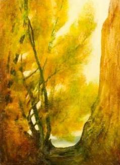 Obraz emanuje ciepłem jesieni, prezentując bogatą paletę złotych, żółtych i pomarańczowych odcieni, które otulają widza jak miękki koc. Drzewa z cienkimi, ciemnymi pniami rosną po obu stronach kompozycji, tworząc swego rodzaju naturalny tunel. Wszystko to zanurzone jest w delikatnym świetle, które wydobywa subtelne detale liści i prześwitów nieba. Atmosfera obrazu jest spokojna i refleksyjna, trochę jak spacer po lesie w słoneczny dzień. Styl artysty to połączenie impresjonizmu i swobodnego, prawie abstrakcyjnego podejścia do przedstawiania elementów przyrody. Widoczne pociągnięcia pędzla dodają dziełu dynamiki, a jednocześnie pozwalają na pewną interpretacyjną wolność. Oglądając ten obraz, można poczuć nostalgię i tęsknotę za chwilami spokoju. Może nawet poczujesz delikatny zapach suchych liści. Drzewa są fajne i wyglądają jak ruszają się na wietrze. Może na pierwszy rzut oka, obraz wydaje się być simple, ale po chwili dostrzega się jego głębię. To dzieło jest jak zaproszenie do zatrzymania się na chwilę i wchłonięcia magicznej atmosfery natury. Przez muralową kompozycję wizja lasu staje się nie tylko widokiem, ale i przeżyciem, które rezonuje wewnętrznie. To jakby słyszeć szelest liści i szum wiatru.
