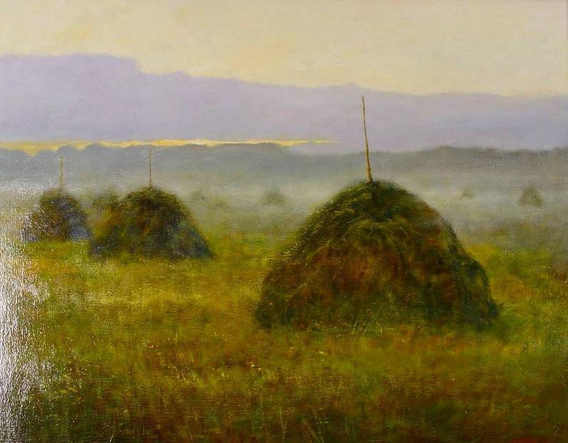 Obraz przedstawia pejzaż wypełniony stogami siana, które majestatycznie spoczywają na zielonej łące. Dominują odcienie zieleni i brązu, a lekka mgła unosi się nad ziemią, nadając scenie aurę tajemniczości. Kompozycja jest spokojna, z wyraźnym horyzontem, gdzie niebo spotyka ziemię w subtelnym uścisku poranka. Stogi wyglądają jak gigantyczne kopce, które kto wie, może skrywają tajemnice. Atmosfera obrazu jest niezwykle nastrojowa. Można niemal poczuć chłodne powietrze poranka i usłyszeć szum trawy. Artysta zastosował miękkie pociągnięcia pędzla, tworząc delikatne przejścia kolorów, co dodaje obrazu malowniczości i łagodności. To klasyczny przykład liryzmu w malarstwie pejzażowym. Elementy na płótnie sprawiają, że czujemy spokój i harmonię z naturą. Te stogi to jak wielkie, zielone góry dla małych zwierzątek, pomyślałby może 7-latek. Ciekawe, co by powiedział... Obraz, choć statyczny, pobudza wyobraźnię i zaprasza do refleksji nad prostotą i pięknem wiejskiego życia. It's simply enchanting! Patsząc na niego, czuje się bliskość z naturą, a kolorystyka uspokaja zmysły.
