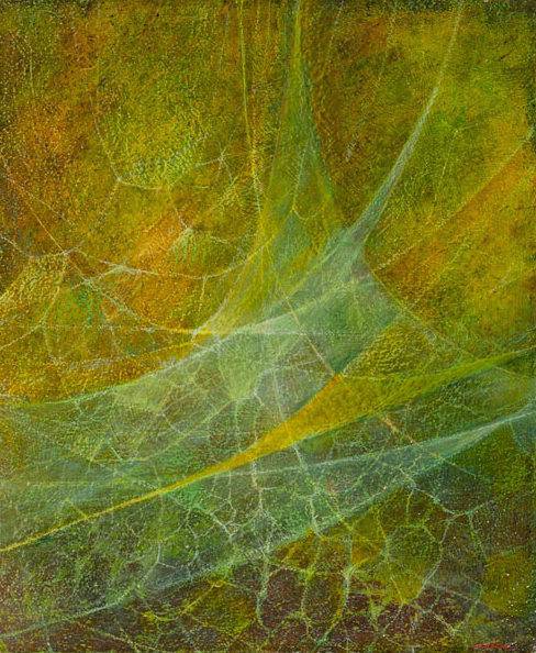 Obraz tętni życiem, eksplozją zieleni i złota. Barwy te przenikają się nawzajem, tworząc misterny splot, przypominający ogromną pajęczynę. Jest jak wiosna budząca się do życia, pełna energii i tajemnicy. Kompozycja rozciąga się poziomo, a sieć linii i kształtów prowadzi oko po całym dziele. Wyobrażam sobie, że dotykając powierzchni, poczułbym fakturę podobną do liścia - chropowatą i pełną historyjek. Atmosfera obrazu jest enigmatyczna, ale zarazem uspokajająca. To jak spojrzenie w głąb lasu o poranku. Styl artysty jest abstrakcyjny, lecz niezwykle organiczny; przypomina mi freski starych mistrzów, ale w bardziej nowoczesnym wydaniu. Technika mieszania barw z lekkością i finezją sprawia, że obraz wydaje się eteryczny, almost magical. Obraz mówi do widza na różne sposoby, wywołuje refleksje na temat natury i życia. Być może to przypomnienie, że w codziennym chaosie warto znaleźć chwilę na zatrzymanie się. "A tutaj jest pajęczynka!" — mogłoby powiedzieć dziecko. Uwielbiam ten moment, gdy przez chwilę odpływam w świat zieleni. Czuję delikatną nostalgię za czymś utraconym, a jednocześnie wdzięczność za piękno chwili obecnej.