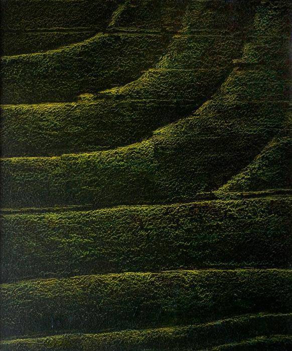Na obrazie widzimy delikatne fale w odcieniach głębokiej zieleni przechodzącej w ciemniejsze tony. Kompozycja jest harmonijna, jakby natura ułożyła zielony dywan na falujących wzgórzach. Czuć w nim spokój i tajemniczość, jakby obserwowało się mroczny, ale kojący zakątek lasu. Styl artysty przypomina techikę impasto - powierzchnia obrazu wydaje się mieć teksturę, co dodaje głębi. Pociągnięcia pędzla są wyraźne, jednak starannie rozmieszczone. Obraz może wzbudzać skojarzenia z granicą między jawą a snem. Ja bym chciał tam pobiec i się ukryć! Rozmyślając, można poczuć ciszę lasu i miękkość mchu. Kolorystyka i nieco abstrakcyjna forma mogą przywodzić na myśl pojęcie "serenity" - spokój. Patrząc na ten obraz, przypomina mi się, jak ważna jest harmonia w naturze i w życiu. Choć pozornie prosty, obraz emanuje siłą i ciepłem, budząc wrażenie wewnętrznego ukojenia. W intensywnej zieleni jest coś magicznego, coś co przyciąga wzrok i nie pozwala się oderwać.