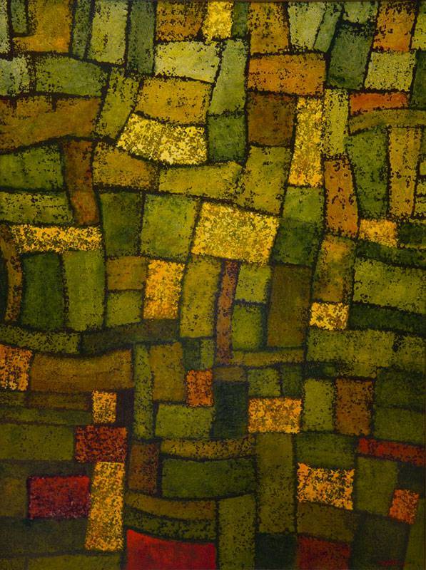 Obraz pełen jest ciepłych, ziemistych tonów. Przede wszystkim dominują zielone odcienie, które łączą się z brązami i złotem. Prostokąty i kwadraty, niczym patchwork, tworzą skomplikowaną mozaikę, która jednocześnie uspokaja i intryguje. Kompozycja sprawia wrażenie uporządkowania i chaosu jednocześnie, jakby ktoś próbował złapać harmonię w otaczającym świecie. Atmosfera jest mistyczna, trochę jakby odpoczynek w lesie w czasie złotej jesieni. Technika? Wydaje się być inspirowana pointylizmem, z delikatnymi plamkami koloru, które dodają głębi i tekstury. To dzieło można by opisać jednym słowem: "enchanting". Patrząc na nie, czuję się, jakbym zaglądał przez okno do nieznanej krainy. Niektórym może kojarzyć się to z abstrakcyjnym snem, gdzie nic nie jest do końca oczywiste. Artysta użył silnych kontrastów, delikatnie balansując na granicy tej ostrości, która przyciąga wzrok. I pomyśleć, że jedno dziecko mogłoby powiedzieć: "To wygląda jak puzzle!" Takie obrazy mogą wywołać uczucie nostalgii, przywołując wspomnienia spacerów po parku, szelestu liści pod stopami. To piękno ukryte w prostocie i ogrom możliwości interpretacji, które wzbudzają emocje.