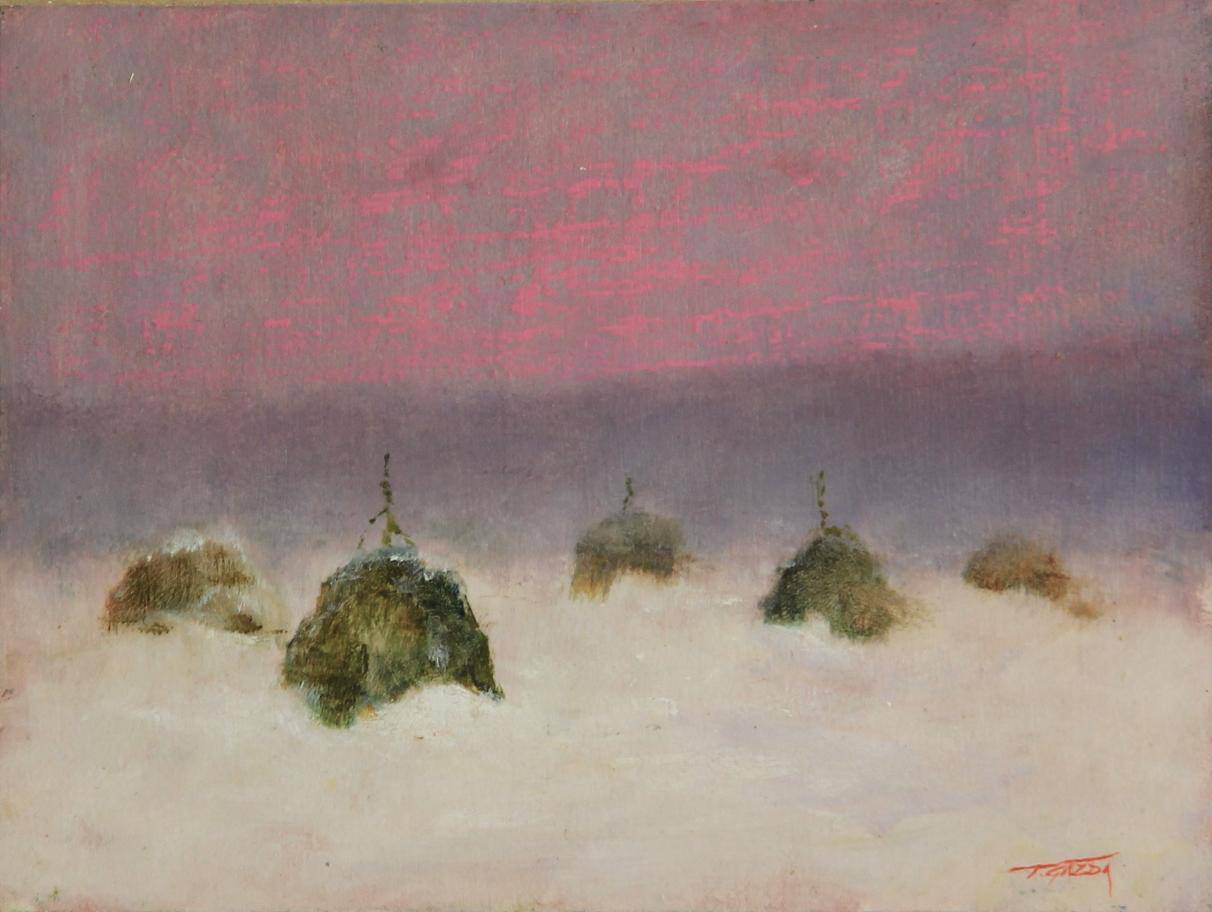 Na obrazie dominuje subtelna gra kolorów - od delikatnych odcieni różu i fioletu po kontrastujące z nimi szarości i ciepłe brązy. To wszystko tworzy niezwykły efekt, który przyciąga wzrok od pierwszego wejrzenia. Stosy siana wyrastają z ziemi jak ciche strażnicy, rozgraniczając jałowy krajobraz i niebo, które jest pokolorowane jakby pędzlem artysty, ledwie dotykającym płótna. Kompozycja obrazu jest spokojna, wręcz medytacyjna, a przestrzeń wydaje się bezkresna. Całość emanuje melancholijnym nastrojem. Artysta zastosował technikę impastu, co dodaje obrazowi ciekawej faktury. Można niemal poczuć ciężar pociągnięć pędzla. Może to był early morning? Widać styl minimalistyczny, prostota formy przywodzi na myśl japońską estetykę wabi-sabi, gdzie piękno tkwi w niedoskonałości. Patrząc na obraz, można poczuć wyciszenie, ale z lekkim ukłuciem nostalgii. Wywołuje to refleksję nad przemijaniem, ale także nad niezmiennością natury. Jakby patrzyło się na zimową ciszę, gdzie czas stanął w miejscu. Hej, te kopki siana wyglądają jak małe pagórki! - powiedziałby dzieciak. Czujesz, jak serce trochę się uspokaja, a myśli zaczynają krążyć wolniej. To chwila, kiedy oglądanie staje się medytacją.