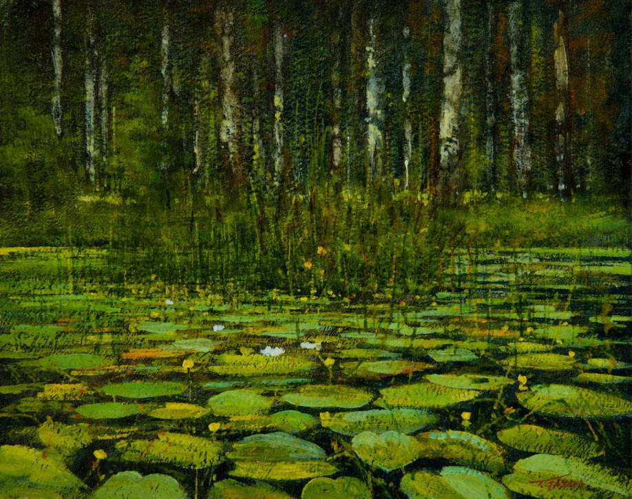 Obraz ukazuje spokojne jezioro z nenufarami, otoczone bujnym lasem. W przewadze dominują zielenie i brązy, tworząc naturalną, harmonijną paletę kolorów. Nenufary rozłożone są symetrycznie na powierzchni wody, a ich delikatne liście unoszą się niczym zielone wyspy. W tle widoczny jest gęsty las brzozowy, który wprowadza do sceny nutę tajemniczości. Całość emanuje spokojem i naturalnym pięknem, sprawiając, że człowiek może się poczuć jakby w środku idyllicznego krajobrazu. Artystycznie obraz przypomina impresjonistyczne malowidła, z wyraźnymi pociągnięciami pędzla i grą światła. Technika zastosowana przez artystę daje wrażenie ruchu, jakby woda delikatnie falowała. Brzozy w tle są jak strzeliste strażniki, które stoją na straży ciszy tego miejsca. Wow, to jest naprawdę magiczne miejsce! Odbiorca może poczuć ukłucie nostalgii lub po prostu zrelaksować się patrząc na tę naturalną sielankę. Może też pomyśleć, jak to jest, poczuć pod stopami chłodne muł jeziora. Dla kogoś innego, to może być "perfect spot" na chwilę kontemplacji. Nastrój obrazu jest spokojny, wręcz kojący. Może przypominać letnie dni spędzone nad wodą, kiedy czas płynie wolniej. Obraz wprowadza w stan zen, gdzie wszystkie troski dnia codziennego wydają się maleńkie. Dla mnie to przypomnienie dzieciństwa, kiedy wszystko było takie proste i pełne uroku.