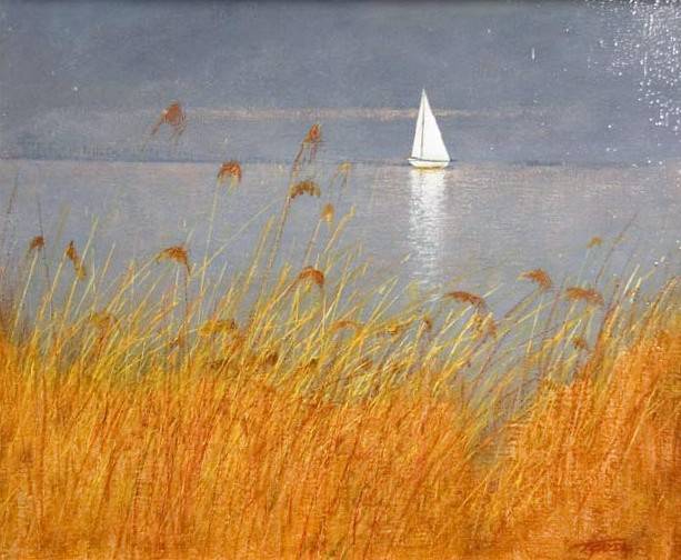Na obrazie dominują ciepłe odcienie złotych traw, falujące na wietrze, tworzące organiczny kontrast z błękitno-szarym niebem tła. W samym centrum znajduje się niewielka biała łódka, która niczym cichy bohater sunie przez spokojną taflę jeziora. Ten urokliwy widok sprawia, że serce rośnie, a wanna chillax unosi się w powietrzu. Kompozycja jest przemyślana, prowadzi wzrok od dynamiki traw ku spokojowi wód i nieba. Można by ją opisać jako impresjonistyczną z delikatnymi pociągnięciami pędzla, które oddają fakturę traw. Obraz emanuje spokojem i harmonią. Jest w nim coś melancholijnego, jak letni dzień, który zapada w pamięć. Można poczuć się jak dziecko biegające beztrosko po polach. "Domku, domku!" - mogłoby krzyknąć dziecko patrzące na ten obraz. Brodzenie w zbożu, słońce grzejące plecy, a wiatr szepczący w uszach. Czuć tu tęsknotę za prostymi radościami. Styl artysty wydaje się celowo uproszczony, koncentrując się na esencji chwili, pozwalającej widzowi na swobodną interpretację. Technika malarska, z naciskiem na subtelne barwy, zachęca do refleksji i kontemplacji. Obraz wywołuje nostalgię za chwilami spędzonymi nad wodą, wśród natury. Wprowadza w stan mindfulness, skłania do docenienia chwili tu i teraz.