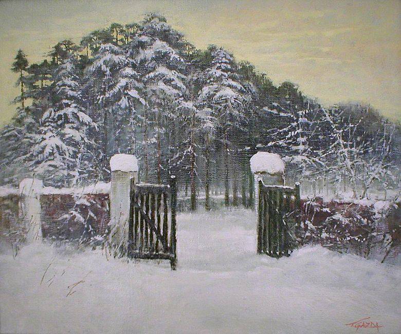 Obraz przedstawia zaśnieżony krajobraz, który zdaje się emanować spokojem i ciszą. Białe płatki śniegu otulają drzewa i ziemię, tworząc miękką, przytulną scenerię. W centrum kompozycji widzimy starą bramę z drewnianymi sztachetami, która prowadzi do tajemniczego, zalesionego obszaru. Drzewa, gęsto pokryte śniegiem, tworzą niemal magiczny tunel, jak z bajki. Niebo jest jasne, o delikatnym, żółtawym odcieniu, co sugeruje poranek lub zmierzch. Sam obraz ma w sobie coś kojącego i zarazem nostalgicznego. Przypomina mi zimy z dzieciństwa, gdy budowało się bałwany, a świat wydawał się pokryty miękką kołderką śniegu. Brama zachęca do wejścia, do przygody. Ciekawe, co się kryje po drugiej stronie! Artysta użył techniki impasto, gdzie grubo nałożona farba nadaje teksturze żywości. Kolorystyka jest stonowana, a jednak pełna subtelnych kontrastów – biel śniegu, ciemne pnie drzew. Obraz emanuje spokojem, ale i pewną tajemnicą. Dream-like, niemalże senny nastrój, można poczuć, patrząc na to piękne zimowe przedstawienie. Osobiście odnajduję w tym dziele chwilę ukojenia i wytchnienia od codziennego chaosu. To jak mała ucieczka w bezpieczny, cichy świat, gdzie czas płynie wolniej. I wiesz co? Ja bym tam pobiegł i zrobił orzełka na śniegu!
