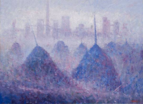 Obraz emanuje spokojem i tajemniczością. Dominują tu bladoniebieskie i szare kolory, które tworzą mglistą aurę, jakby świat ogarnęła miękka zasłona mgły. W centrum widzimy kształty przypominające stosy siana, pokryte cienką warstwą tego, co można by nazwać magiczną poświatą. Dłoń artysty najwyraźniej bawiła się techniką impresjonizmu, co łatwo dostrzec po grubo kładzionych pociągnięciach pędzla i delikatnie rozmytych konturach. Wydaje się, że obraz żyje i oddycha, a powietrze jest wypełnione wilgotną świeżością. Mogę się założyć, że patrząc na to dzieło, każdy poczuje lekki chłód na policzkach. Artysta doskonale uchwycił ten magiczny moment dnia, kiedy świat zdaje się zatrzymywać na chwilę. Dla mnie, patrzenie na to jest extra peaceful, naprawdę. Odbiorca może poczuć nostalgię za czymś ulotnym. Można by pomyśleć, że to ilustracja krainy z dziecięcych snów, pełnej fantazji. Ja myślę, że to wygląda jak poranek po deszczu, kiedy wszystko jest takie świeże i nowe. To takie magiczne! Obraz zaprasza nas do refleksji i zatopienia się w marzeniach, a ja naprawdę czuję tę ciszę i spokój.