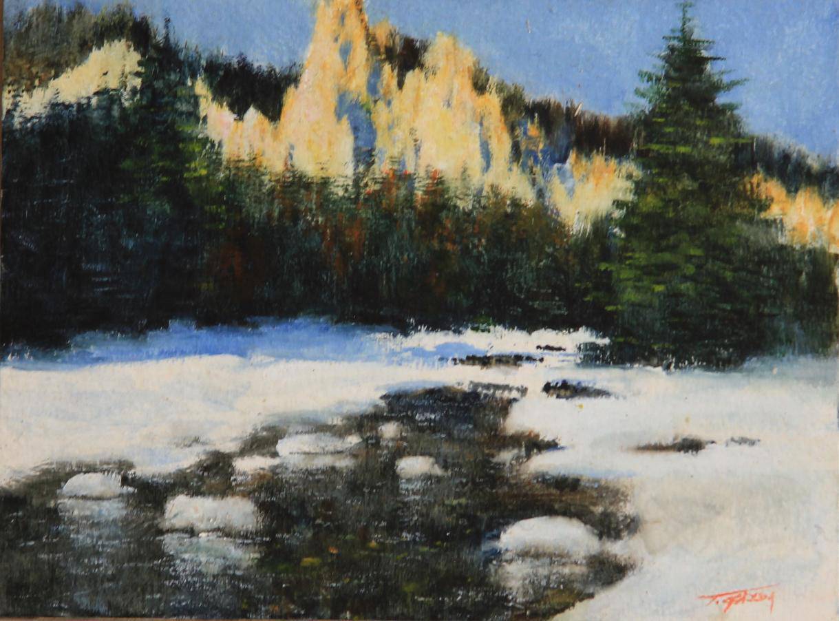 Na obrazie widzimy zimowy krajobraz, który tętni spokojem i urokiem natury. Dominują chłodne odcienie bieli, zieleni i błękitów, które harmonijnie łączą się z ciepłymi żółtymi plamami w tle. Góry przypominają gigantyczne zęby, kontrastując z miękką linią lasu na pierwszym planie. Ta kompozycja przywodzi na myśl wyciszenie, ale też odrobinę tajemnicy. Artysta zastosował technikę impastową, zaznaczając delikatne pociągnięcia pędzla, co dodaje pracy tekstury i głębi. Śnieg pokrywający ziemię wydaje się niemal puszysty, podczas gdy lodowata woda łagodnie odbija otoczenie. Jest coś magicznego w tej zimowej scenerii, co sprawia, że czujemy się jakbyśmy tam byli – w środku mroźnej ciszy. Obraz może budzić mnóstwo emocji. Zachwyt nad pięknem natury, odrobinę nostalgii za śnieżnymi dniami, a może i tęsknotę za ciepłem przy ciepłym kominku. Dziecko powiedziałoby: „Ale fajne duże góry!”. To dzieło, które zasługuje na chwilę uwagi. Wow, it’s simply captivating!