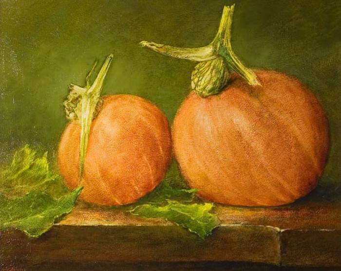 Na obrazie widzimy dwa dorodne pomarańczowe dynie spoczywające na drewnianej powierzchni. Otacza je kilka zielonych liści rozsypanych niczym w jesiennym chaosie. Tło to głęboki, ciemnozielony kolor, który tworzy kontrast z intensywną barwą dyni. Kompozycja jest prosta, ale jednocześnie niezwykle harmonijna. Każdy szczegół jest starannie przemyślany. Atmosfera tego obrazu jest spokojna, wręcz nostalgiczna. Kojarzy mi się z ciepłym wieczorem gdzieś na wsi, gdzie czas płynie wolniej. Technika artystyczna wskazuje na realistyczne podejście, dokładność w oddaniu kształtów i tekstur. Można wręcz poczuć, jak miąższ dyni ugina się pod dotykiem. Light and shadow grają tu pierwsze skrzypce, nadając całej scenie trójwymiarowości. Emocje? Pełne ciepła i spokoju. Obraz może wywołać uśmiech, przypominając o dzieciństwie i beztroskich czasach, kiedy robiło się lampiony na Halloween. Patrząc na to dzieło, można poczuć zew natury i pragnienie powrotu do prostszych czasów. Jak dotyka się dyni, to jest taka fajna, chropowata. Każdy kto spojrzy na ten obraz, znajdzie w nim coś dla siebie. Jest w nim coś magicznego, co sprawia, że człowiek się zatrzymuje i myśli o pięknie prostych rzeczy.