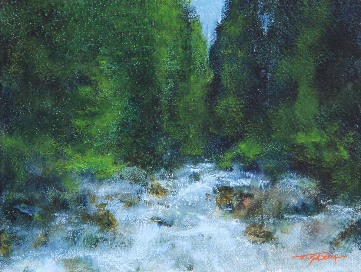 Obraz przedstawia bujny, leśny krajobraz, wypełniony głęboką zielenią drzew i miękką bielą wodospadu. Drzewa tworzą gęsty, niemalże nieprzenikniony mur po obu stronach. Kolory są nasycone, od ciemnej zieleni po niebieskawe cienie, które nadają tajemniczy vibe całości. Woda na pierwszym planie płynie z impetem, jej biel kontrastuje z resztą sceny. Kompozycja jest dynamiczna, z akcentem na przepływ wody, który zdaje się wieść oczy widza w głąb obrazu. Atmosfera tchnie spokojem i jednocześnie dzikością natury. Możemy niemal poczuć chłodną bryzę i usłyszeć szum nurtu. To miejsce, gdzie zapomina się o zgiełku codzienności, by odnaleźć chwilę wytchnienia. Zielono-niebieska paleta barw wprowadza nastrój ulgi i medytacji. Styl artysty można określić jako impressionistic. Użyte są szybkie, krótkie pociągnięcia pędzlem, które oddają ruch i żywotność leśnego strumienia. Technika ta wprowadza ulotność chwili, złapanej między jednym a drugim oddechem natury. Czuć tu pewną bezpośredniość, ale i finezję. Patrząc na ten obraz, odczuwa się spokój i harmonię. Może wywoływać nostalgiczne wspomnienia z wakacji spędzonych na łonie natury. Ach, chciałoby się tam być znowu! To miejsce jest prawdziwym escape od miejskiego zgiełku, a nawet echo history speaks. Dla siedmioletniego dziecka to miejsce, „gdzie woda śpiewa i drzewa są tak duże, jak dinozaury!” Zwracając uwagę na emocje, widz może poczuć się jakby odkrywał zaginione królestwo zieleni, pełne tajemnic i ukrytych skrótów, gdzie czas płynie inaczej. Obraz nie tylko zachwyca, ale też, co ważniejsze, inspiruje do odkrywania świata przyrody na nowo....
