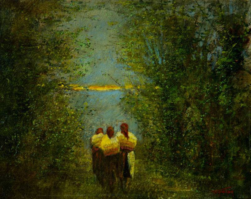 Obraz przedstawia scenę wieczornego spaceru trzech kobiet przez zaciszny, leśny zakątek. Paleta kolorów jest stonowana, pełna zieleni i brązów, a pomiędzy drzewami przebija delikatny niebieski nieba i złote światło zachodu słońca. Kompozycja obrazu, z centralnie usytuowanymi postaciami, prowadzi wzrok widza w coraz głębsze zakamarki lasu. Atmosfera tej sceny jest spokojna i trochę nostalgiczna, jakby czas zwolnił, a świat stał się bardziej magiczny. Artystyczny styl jest impresjonistyczny. Jest tu dużo swobody w technikach pociągnięć pędzla, które nadają teksturę i dynamikę krajobrazowi. Obraz wywołuje w odbiorcy wiele emocji – od spokoju, przez zaciekawienie, aż po tęsknotę za naturą. Można poczuć, że te trzy kobiety mają przed sobą szczególną podróż, choćby tylko do domu. Czuję, jakby na chwilę przeniesiono mnie do bajkowego świata. A kto wie, co się czai za tamtym zakolem drzew? My seven-year-old self might wonder if they'll find a secret castle or maybe a friendly dragon. Obraz wprowadza w melancholijny nastrój, ale jest też pełen nadziei. To ten rodzaj sztuki, który zostawia ślad w sercu.