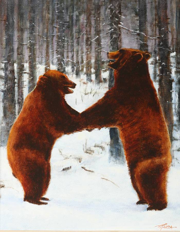 Na obrazie widzimy dwa niedźwiedzie, które wyglądają jakby tańczyły w zimowym lesie. Ich futro ma ciepły, brązowy odcień, który kontrastuje z chłodną bielą śniegu. Drzewa w tle są ponure i bez liści, tworząc surową, zimną scenerię, która podkreśla ich radosny taniec. Cała scena jest jak wesoły winter wonderland, gdzie choć zima jest surowa, to jest też pełna życia. Atmosfera obrazu jest lekka i radosna, niemal czujemy ruch i śmiech zwierząt. Artysta zastosował miękkie pociągnięcia pędzla i subtelne przejścia kolorów, co nadaje dziełu delikatności. Styl obrazu jest realistyczny, ale z nutą bajkowego uroku. Moglibyśmy prawie poczuć, jak mróz szczypie w nos, gdy patrzymy na to dzieło. To obraz o przyjaźni i radości, które można znaleźć w nieoczekiwanych miejscach. Patrząc na niego, mogą ci się przypomnieć chwile dziecięcej beztroski. A co, jeśli wyobrazimy sobie, że te niedźwiedzie tańczą walca na swojej śnieżnej scenie? Wow, to dream come true. Z tą sceną łączy nas pewna nostalgia - może przypominać o wspólnych chwilach z przyjaciółmi. Nawet w najsurowszych warunkach przyjaźń i radość przetrwają. Obraz emanuje pozytywną energią. Jest tak: patrzysz i ciepło ci się robi na sercu.