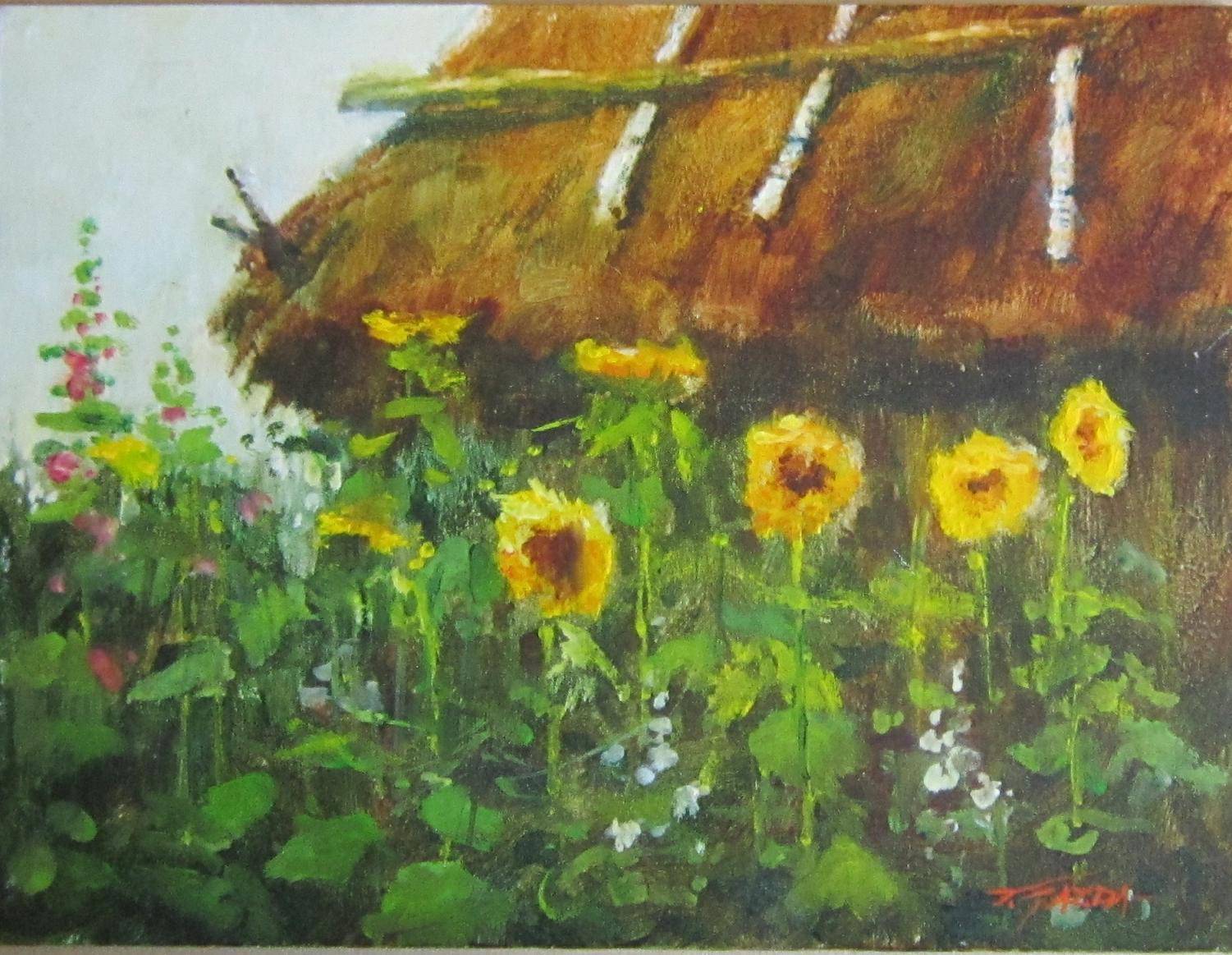 Obraz ukazuje malowniczą scenę pełną kolorów i życia. Dominują zielenie i żółcienie, wyrażające energię i radość natury. Kwiaty słoneczników kołyszą się na wietrze, a ich złote główki kontrastują z soczystą zielenią łodyg i liści. W tle widać chatę z wiejskim dachem, co dodaje klimatu sielskiej wsi. Kompozycja jest harmonijna, z naciskiem na centralne umiejscowienie roślin. Atmosferę obrazu można opisać jako spokojną i idylliczną. Wyczuwalny jest klimat lata, ciepło słońca i prostota życia na wsi. Styl malarski to typowy dla impresjonizmu, z miękkimi pociągnięciami pędzla, które subtelnie mieszają kolory i formy. Użyta technika sprawia, że obraz wydaje się być niemalże uchwyconą chwilą, momentem "caught in time", pełnym dynamizmu i ulotności. Odbiorca może poczuć nostalgię za prostszymi czasami, za chwilami odpoczynku i bliskości natury. Obraz przyciąga wzrok i zaprasza do refleksji, do zatrzymania się na chwilę w codziennym pędzie. “Ło, jakie duże kwiatki!” – tak mogłoby powiedzieć dziecko zachwycone tą prostą, ale jakże piękną sceną. To dzieło przywołuje uśmiech i ciepło w sercu, nawet w chłodne dni. Niezwykły jest ten obraz, i to w nim jest najpiękniejsze.