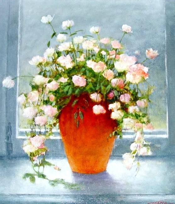 Obraz przedstawia piękny, terra-cotta wazon pełen delikatnych różowych kwiatów. Rozświetlają one przestrzeń swoimi subtelnymi pastelowymi tonami, kontrastując z głębokim pomarańczem wazonu. W tle widać spokojną, niebiesko-szarą ścianę, która dodaje uczucia spokoju i harmonii. Całość tworzy kompozycję pełną równowagi, a światło łagodnie opływa kwiaty, jakby chciało je otulić ciepłym blaskiem. Atmosfera tego dzieła jest niezwykle sielankowa. Można poczuć, jakby czas na chwilę stanął w miejscu, jakbyśmy byli świadkami idealnego momentu w naturze. Taki widok budzi pozytywne emocje, koi nerwy. Technika użyta przez artystę jest delikatna i subtelna, kładzie nacisk na miękkie przejścia kolorów. Widać wpływ impresjonizmu, a może nawet odrobinę realizmu w przedstawieniu detali. Patrząc na ten obraz, można poczuć radość, a nawet tęsknotę za letnimi dniami. Wyobrażam sobie, że siedzę przy oknie, patrzę na te kwiaty i zastanawiam się nad sensem życia. It's beautiful. Dziecko by powiedziało: Te kwiatki są jak cukierki! Taka prostota też ma w sobie coś magicznego. Czasem tylko kwiaty w wazonie mogą poprawić nam dzień i przypomnieć, co jest naprawdę ważne – chwile spokoju, które dają nam siłę.