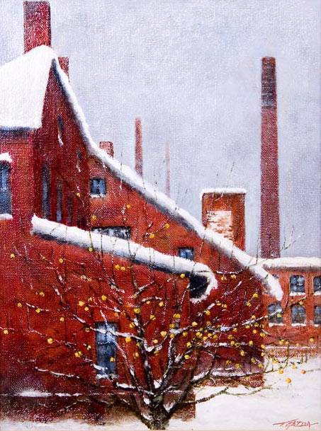Na obrazie widzimy spokojny zimowy pejzaż. Dominują odcienie czerwieni i bieli, które kontrastują ze sobą. Ceglane budynki, pokryte śniegiem, tworzą kształty proste i geometryczne. Śnieg osiadł na gałęziach drzewa, dodając do scenerii chłodną warstwę. Scena wydaje się być statyczna, jakby zatrzymana w czasie. Nastrój jest nostalgiczny, a jednocześnie pełen ciepła, mimo zimowego tła. Można niemal poczuć mróz szczypiący w policzki. Styl artystyczny jest impresjonistyczny, artysta bawi się światłem i fakturą. Widoczne są pociągnięcia pędzla, które dodają dynamiki. Użycie światłocienia nadaje głębi i sprawia, że budynki wydają się niemal trójwymiarowe. Obraz, choć prosty, przyciąga uwagę detalem i specyficznym urokiem. Patrząc na to dzieło, można poczuć spokój, jakby czas zwolnił. Dla niektórych może też wywoływać wspomnienia dzieciństwa i zabawy na śniegu. Jest tu coś magicznego; to "winter wonderland", jak powiedziałby ktoś po angielsku. Hej, zobacz! Śnieg na dachu wygląda jak bita śmietana! Czyż to nie sprawia, że uśmiech sam pojawia się na twarzy? To dzieło jest jak przytulny koc, którym chce się okryć, patrząc na zimowy krajobraz z bezpiecznego, cieplutkiego wnętrza.