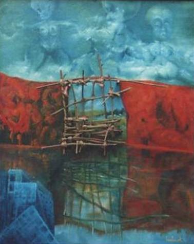 Obraz uderza intensywnością kolorów: głęboki niebieski, krwiście czerwona połać ziemi oraz zardzewiałe brązy tworzą niepokojący, wręcz surrealistyczny krajobraz. Kompozycja jest dynamiczna, z centralnym elementem w formie prymitywnej konstrukcji z patyków, która przypomina dziecięcą zabawkę albo splątane gałęzie. Atmosfera jest tajemnicza i trochę nie z tej ziemi. Taka, że od razu człowiek zaczyna się zastanawiać, co artysta miał na myśli. Myślisz: wow, to jest takie dreamlike! Technika malarska, z wyraźnie widocznymi pociągnięciami pędzla i szorstkością tekstur, dodaje charakteru. Dzieło emanuje niepokojem i prowokuje do refleksji nad chaosem i porządkiem. Niebo na obrazie z twarzami postaci jest zdecydowanie upiorne, przypomina chwilę, kiedy wyobraźnia dzieciaka ucieka w dzikie rejony. Ja bym tam chyba nie chciał być sam w nocy. To ewidentnie sztuka wymykająca się prostym interpretacjom, gdzie każdy może dostrzec coś innego. Artysta bawi się naszą percepcją, igra z granicą między rzeczywistością a snem, dając odbiorcy przestrzeń na własne przemyślenia.