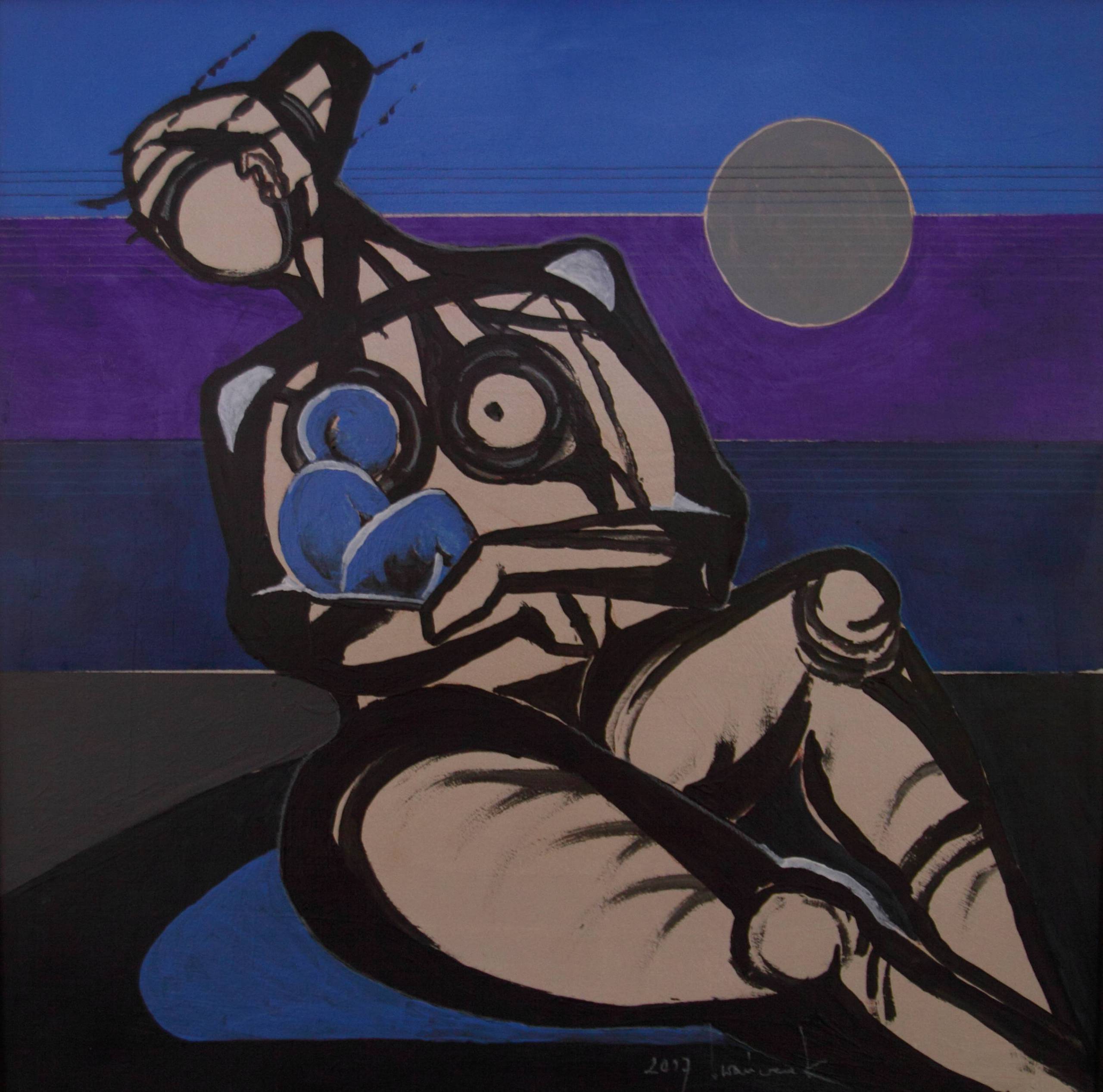 Na obrazie dominuje kontrast między intensywnym niebieskim a głębokim fioletem, które tworzą tło. Centralna postać to abstrakcyjna sylwetka, złożona z czarnych konturów i geometrycznych kształtów, tworząc wrażenie kubistycznego stylu. Jasne odcienie skóry przeplatają się z cieniami, dodając dynamiki. Kompozycja jest oszczędna, lecz intensywna. Moonlight (księżyc!) na horyzoncie wzmacnia tajemniczy nastrój. Obraz emanuje poczuciem spokoju, ale także ukrytej tęsknoty. Artysta użył techniki mieszania tonów, co nadało dziełu głębi. Małe dziecko mogłoby powiedzieć: "Ta postać wygląda jak z plasteliny!". Emocje, które wyłaniają się z obrazu, balansują na granicy nadziei i refleksji. Ten niezwykły mix kolorów i kształtów tworzy atmosferę, w której można się zagubić. Obraz może pobudzać do myślenia o poszukiwaniu siebie czy powiązaniach z innymi. atmosfera jest nostalgiczna, a jednocześnie pełna enigmy. Trudno oderwać od niego oczy.