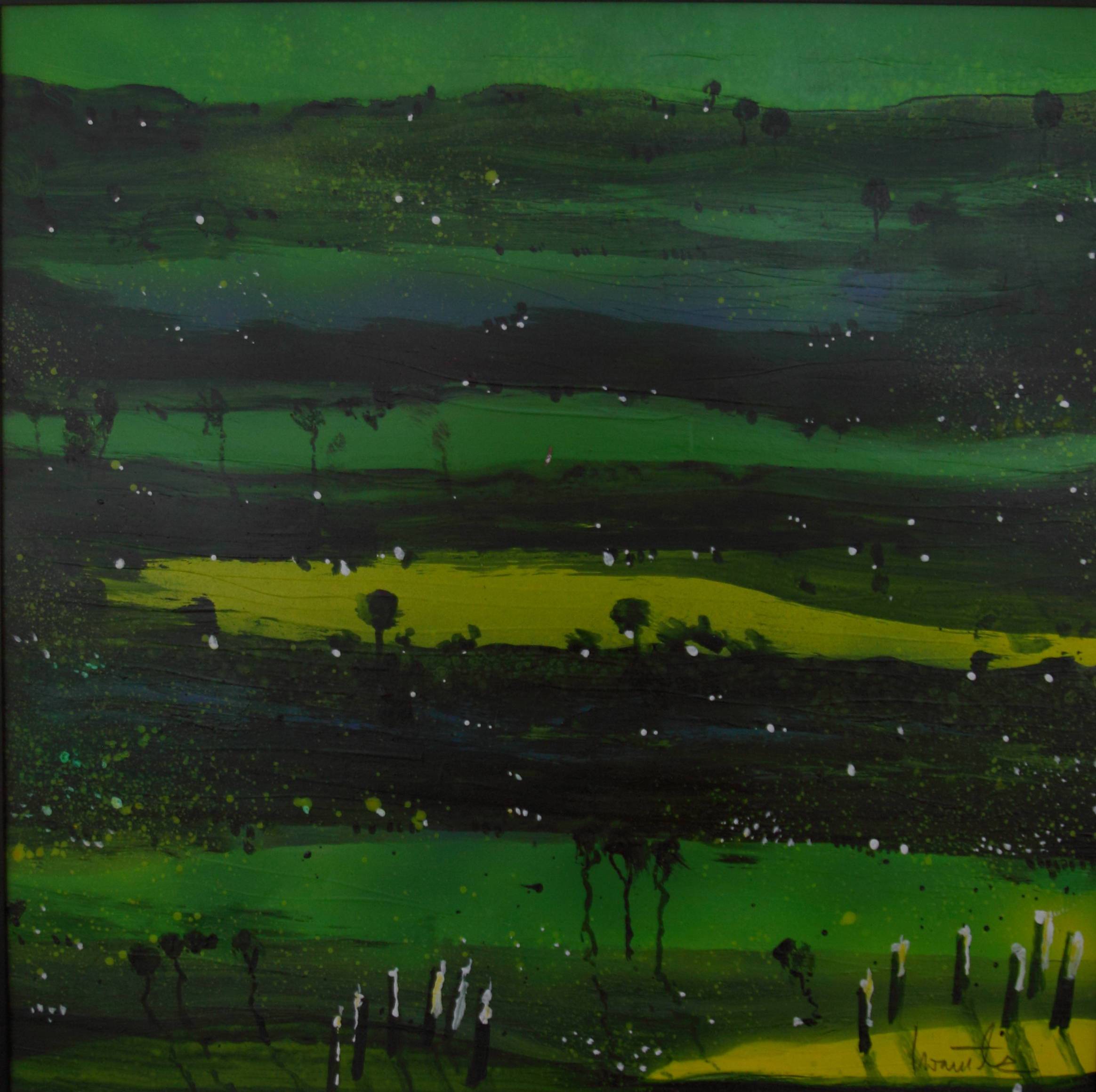 Obraz to prawdziwe zielone morze z odcieniami, które falują, tworząc dynamiczny krajobraz. Dominuje tu głęboka zieleń, przecięta jasnymi pasami limonki. Subtelne plamy ciemnego granatu dodają głębi. Królują tutaj smugi i plamy, które tworzą warstwy niczym fale na oceanie. Artysta zastosował technikę, która przypomina akwarele, z delikatnym rozmyciem kolorów. Atmosfera jest spokojna, ale z delikatnym napięciem. Może to jest miejsce głębokiej zadumy. Skupienie na zieleniach sprawia, że to idealne miejsce do odpoczynku umysłu. Ale zobacz, tam są białe kropki! Właśnie jak gwiazdy na nocnym niebie! Tylko że to niebo zielone. Obraz emanuje harmonią przyrody, a może nawet nostalgią za utraconym rajem. "Wow" - to jedno słowo przyszło mi do głowy. Kompozycja jest przemyślana, ale nieformalna, pozwalająca widzowi snuć własne opowieści. Dzieło może wywoływać emocje odprężenia, ale też małego lęku przed nieznanym. To coś w rodzaju "look closer", a odkryjesz więcej. Próbuje odczytać, czy są tu jakieś ukryte znaczenia, ale bardziej sobie wyobrazam, co autor chciałby powiedzieć. Obraz przypomina mi letnią łąkę w świetle księżyca.