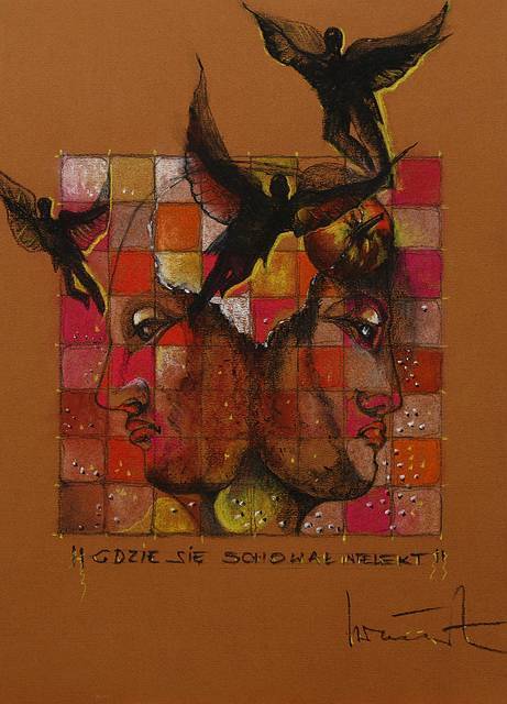 Na obrazie widzimy kolaż barwnych kwadratów, które stanowią tło dla dwóch profilów twarzy. Kolory są ciepłe, dominują czerwienie, brązy i pomarańcze, tworzące harmonijną kompozycję. Na tym tle kontrastują czarne sylwetki ptaków, które to wzbijają się w powietrze, to skrzydła szeroko rozpościerają. Kompozycja przywodzi na myśl różnorodność emocji i myśli, które, jak te ptaki, krążą wokół umysłu. Atmosfera obrazu jest jednocześnie niepokojąca i intrygująca. Wzbudza uczucie tajemnicy, a może nawet zagubienia. Artysta wykorzystał technikę mieszaną, łącząc rysunek z elementami kolażu. Widoczne pociągnięcia pędzla dodają dynamiki i głębi. Dla odbiorcy obraz może być metaforą wewnętrznej walki lub poszukiwania sensu. Ja myślę, że to wszystko to takie "where's the intellect?", pokazując, jak gubimy w natłoku zajęć to, co naprawdę istotne. Dla 7-latka: Te ptaki są wolne jak mój latawiec. Ujęcie obrazów, które zostają w pamięci, to prawdziwe sztuka.