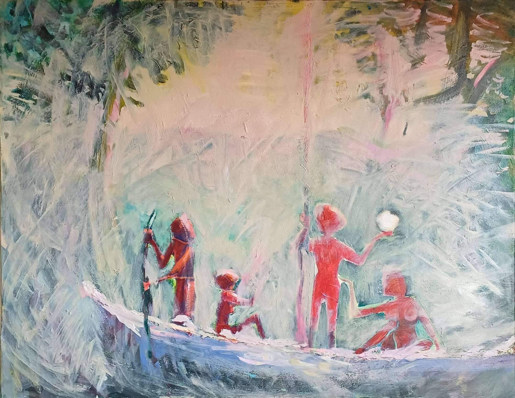 Na obrazie widzimy grupę postaci o rozmytych kształtach, dryfujących w łodzi pośród tajemniczej dżungli malowanej pastelowymi kolorami. Tło wypełniają fale zieleni i błękitu, które niczym delikatne pociągnięcia pędzla tworzą niemalże eteryczną mgłę. Jasne, świetliste różowe smugi dodają nutę romantyzmu i trochę fairy tale klimatu. Całość składa się na bardzo abstrakcyjną kompozycję, która bardziej przypomina wspomnienie niż konkretne miejsce. Czujesz spokój, ale jednocześnie coś jakby czające się napięcie. Styl jest ekspresyjny, pełen impresji i swobodnych ruchów pędzla, co nadaje dziełu dynamikę. Artysta z pewnością bawi się teksturą, co wzmacnia wrażenie głębi i ruchu. Dla mnie obraz wygląda jak scena z opowieści, może o przygodzie, poszukiwaniu. Te bezkształtne postacie w łodzi przypominają dziecięce marzenie o eksploracji nieznanego. Ja bym tam popłynął i znalazł ukrytą wyspę z skarbem! To taki "magic moment", chwila uchwycenia czegoś nieuchwytnego w ruchu pędzli. Można poczuć ekscytację, tę lekkość i chęć wyruszenia w nieznane. Za każdym razem, gdy patrzę na ten obraz, odkrywam coś nowego. Coś, co do mnie mówi, zwłaszcza to tajemnicze światło w ręku jednej z postaci. Może doba wychodzenia z mroku?