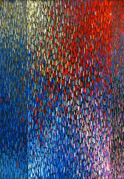 Obraz jest istną eksplozją koloru. Czerwienie, błękity, zgaszone szarości mieszają się w tańcu drobnych, pionowych kresek. Te intensywne barwy i ich zderzenie przywodzą na myśl ruch, jakby całość wibrowała. Patrząc na to, ma się wrażenie pulsującej energii. Nastrój jest dość dynamiczny, tętniący życiem, chociaż w pewien sposób chaotyczny. Mozna się w tym zgubić, ale w pozytywnym sensie. Myślę, że jest pełen life. Artysta posłużył się techniką, która przyciąga uwagę, choć na pierwszy rzut oka wydaje sie banalna. Z bliska widać, że te drobne kreski tworzą niemalże fakturę - jakby malarz bawił się, próbując stworzyć coś naprawdę oryginalnego. To wrażenie kontrastów i gry świateł zachęca do zastanowienia się nad emocjami ukrytymi za każdą warstwą farby. Patrząc na ten obraz, można poczuć się zaintrygowanym, a nawet nieco przytłoczonym. Jakby się patrzyło na niebo pełne spadających gwiazd - "Ojej, ile tego"! Dla mnie osobiście, ma w sobie coś czego po prostu nie da się łatwo opisać. To, co jest wewnętrzne, skryte, wywołujące refleksję nad naszą własną chaotycznością.