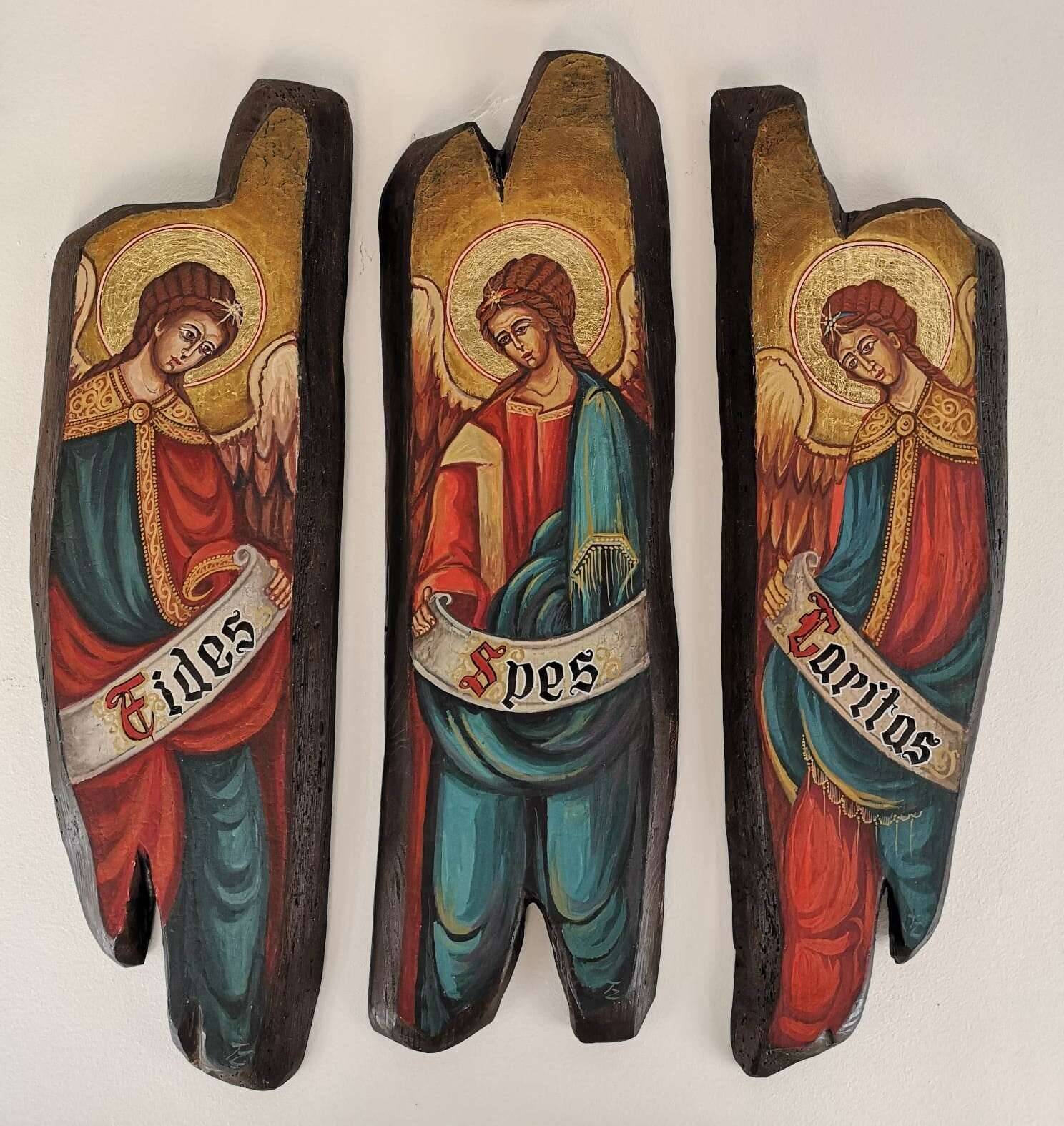 Na obrazie widzimy trzy malowane postacie aniołów na kawałkach drewna, które natychmiast przyciągają wzrok kontrastem między złotymi aureolami a głębokimi odcieniami czerwieni i niebieskiego. Każdy anioł trzyma w dłoniach wstęgę z napisem: "Fides", "Spes" i "Caritas". Kompozycja jest ciekawa, bo nie jest typowo symetryczna. Kształty drewna są nieregularne, co dodaje pracy rustykalnego uroku. Artystycznie, technika wydaje się inspirowana ikoną, z wyraźnym konturem i bogactwem detali. Obraz emanuje spokojem, poczuciem równowagi i duchowego zanurzenia. Kiedy na niego patrzę, czuję mieszankę nadziei i refleksji nad istotą wiary. To trochę jak "peace of mind", które przynosi spokój duszy. 7-letnie dziecko mogłoby powiedzieć: Anioły są jak kolorowe ptaki, które chcą fruwać. Całość daje poczucie, jakby te postacie mogły opowiadać własne historie, ukryte między warstwami farby i drewna. Ciekawym detalem są napisy na wstęgach, które przypominają o cnotach teologicznych. Może ten obraz jest jak okno do duchowego świata, dające ukojenie?