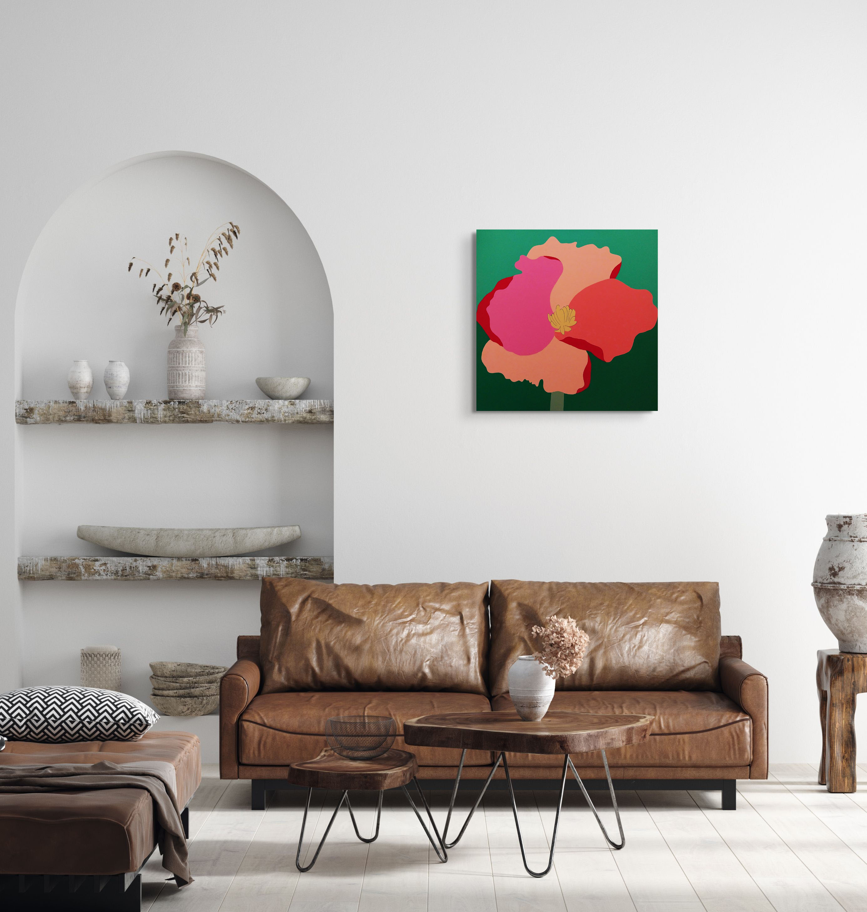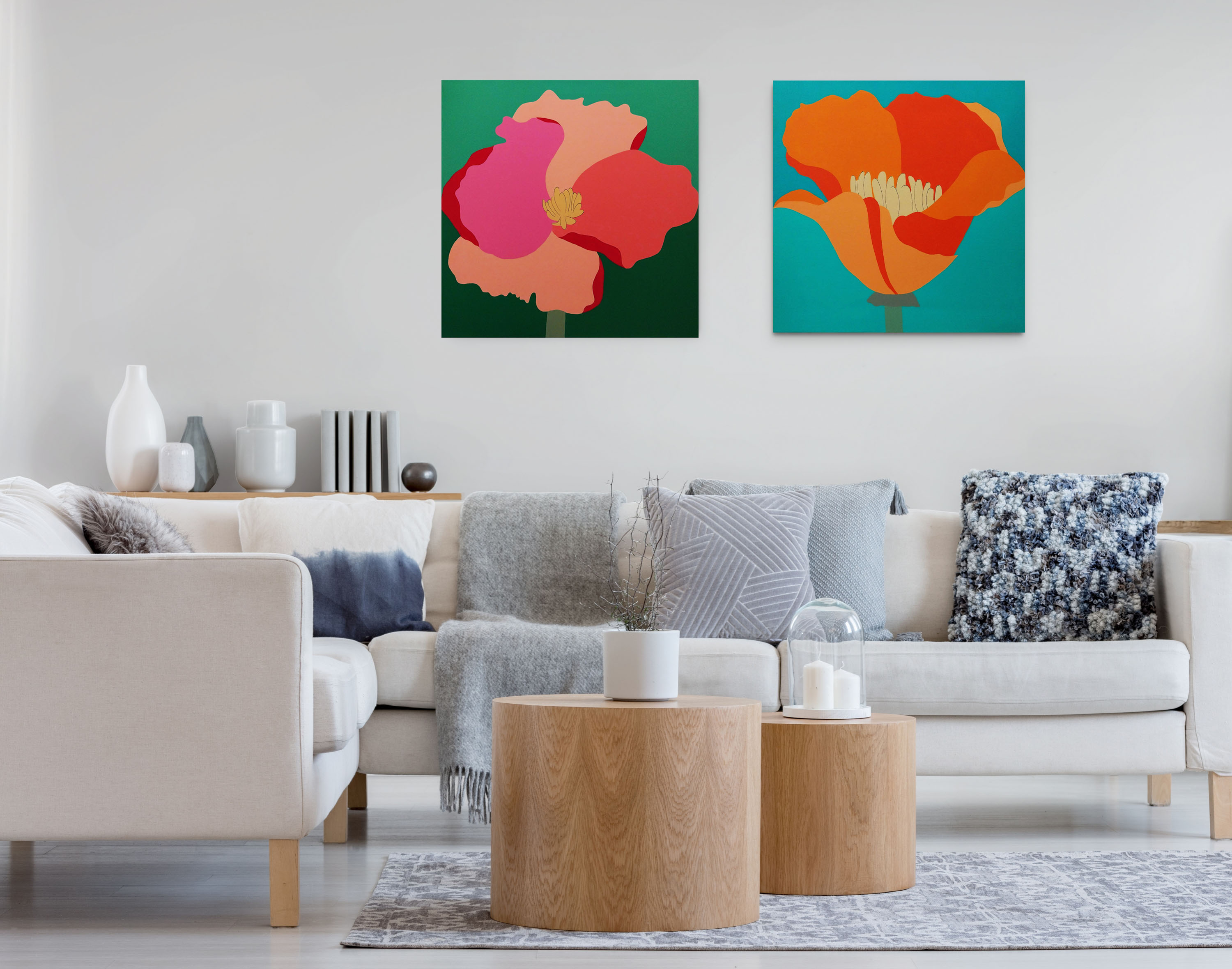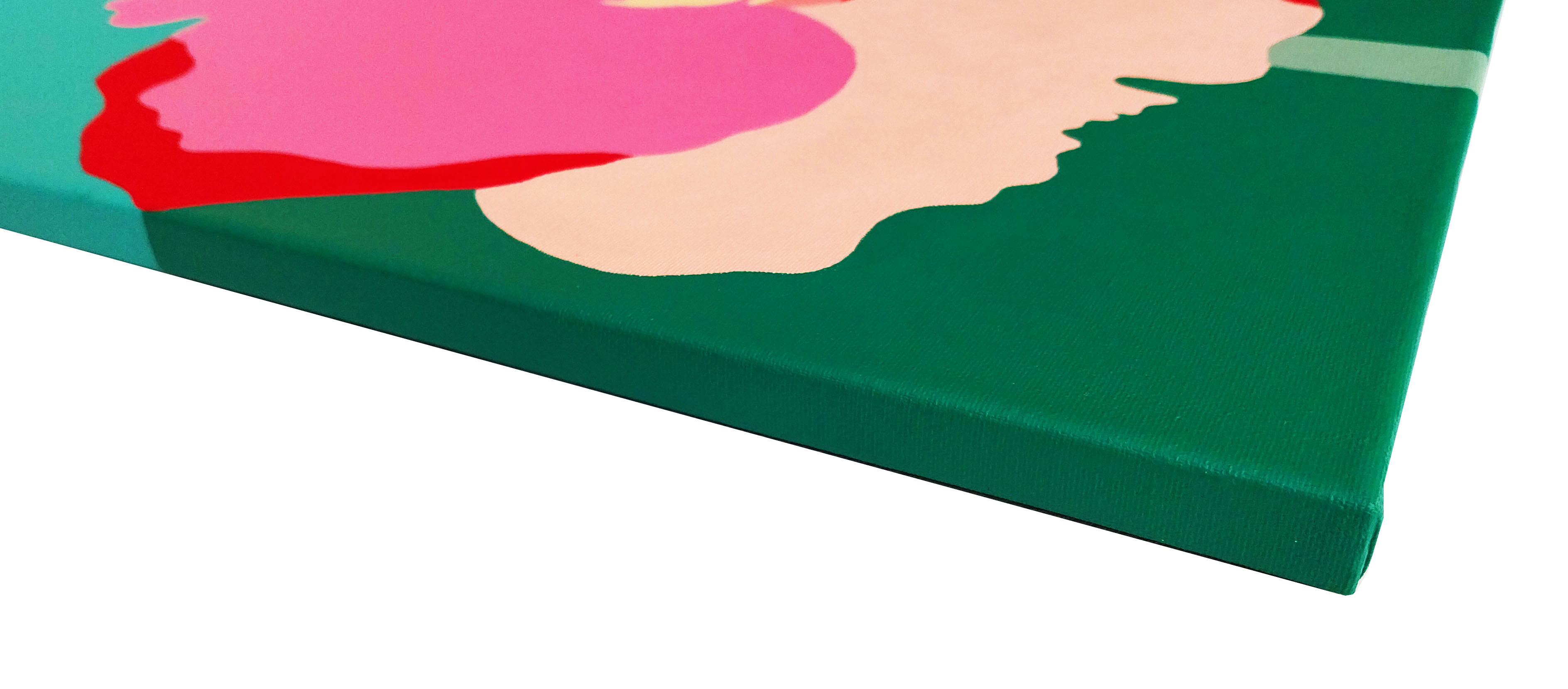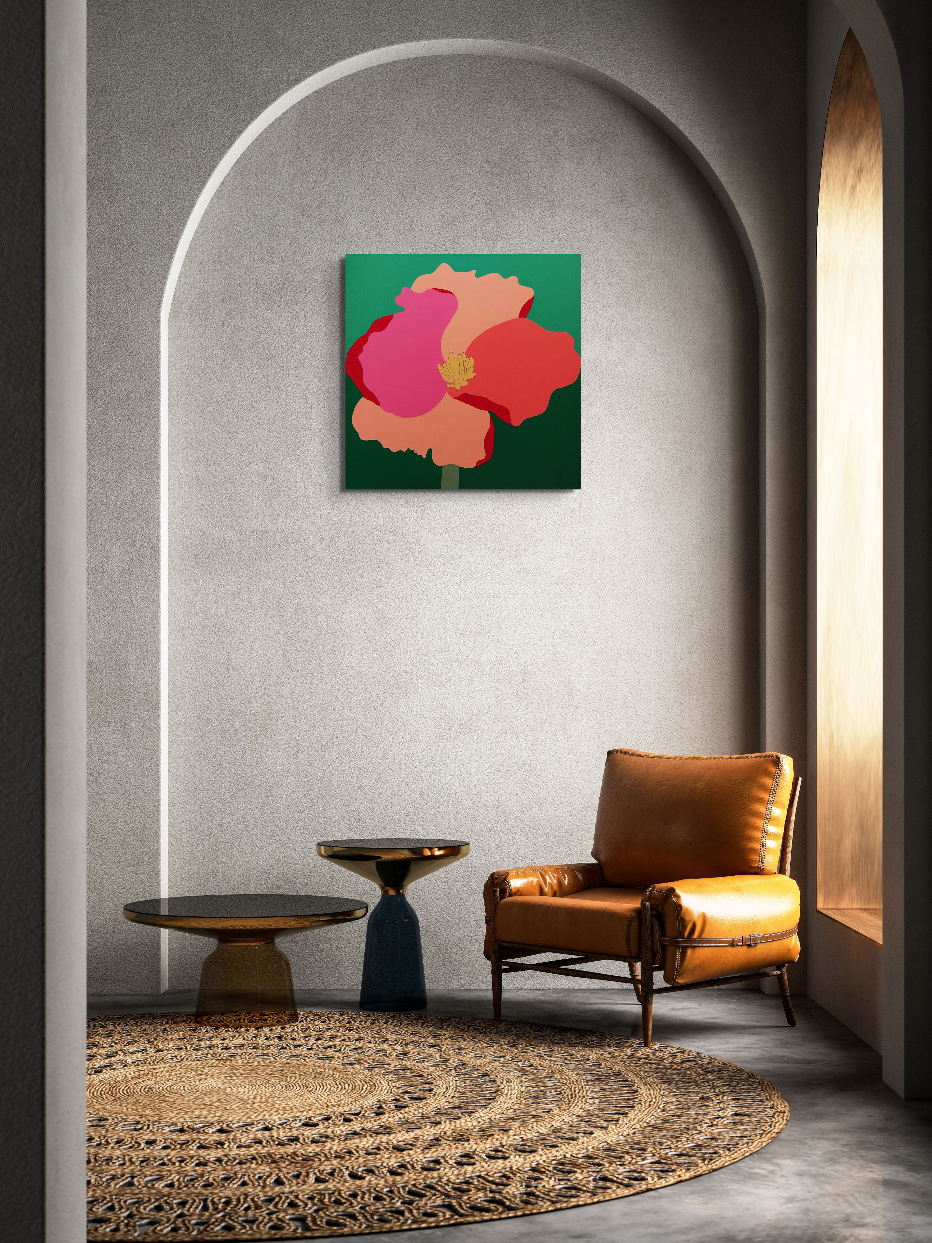 Nowoczesny kolorowy obraz kwiatowy nawiązujący stylem do pop-art. Praca jest minimalistyczna, ale równocześnie pełna pozytywnej energii. Obraz z kolekcji POP-KWIAT. Praca m zamalowane boki, więc rama nie jest wymagana.
