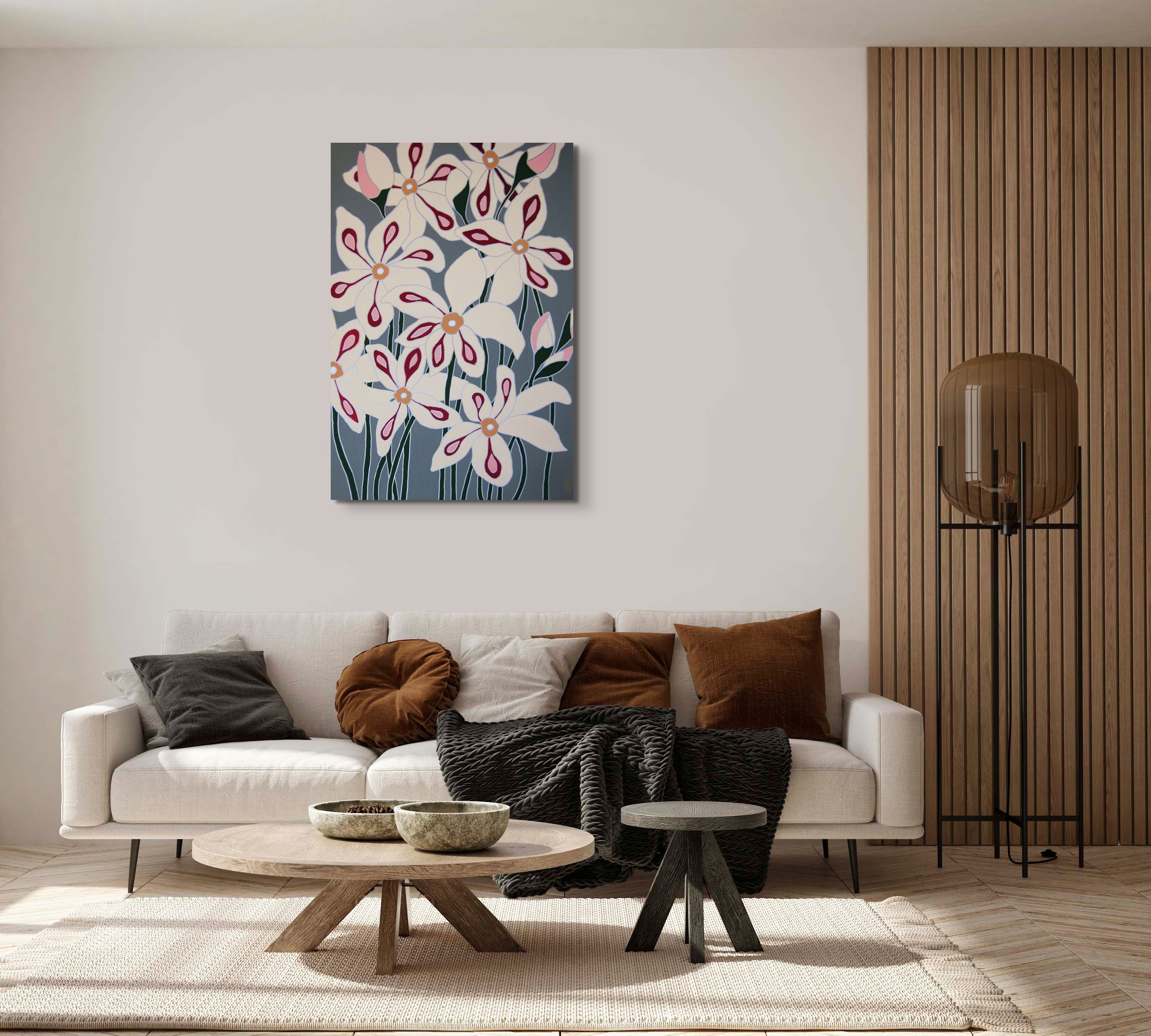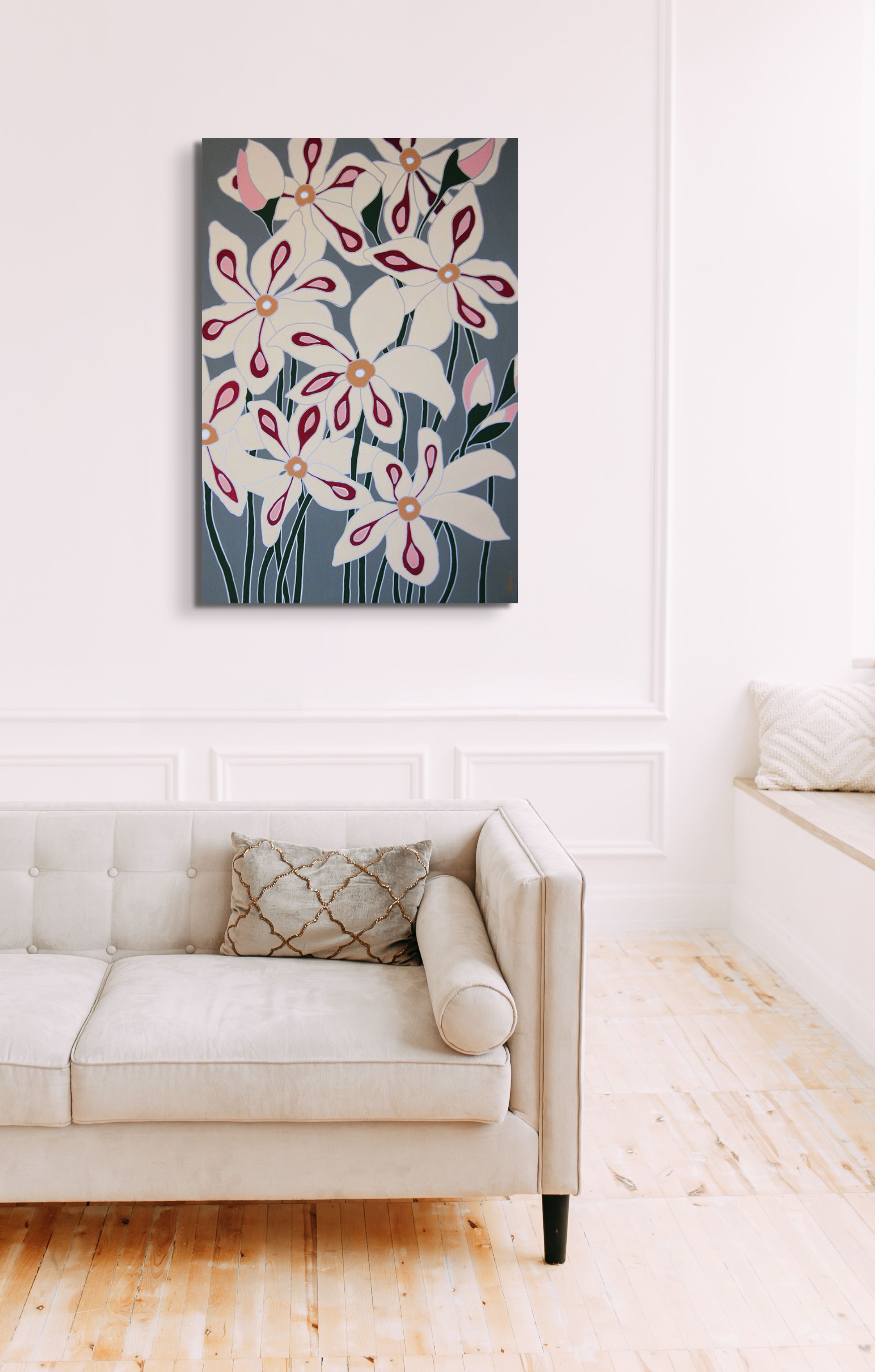 Duży obraz pełen życia a zarazem emanujący spokojem. Kompozycja inspirowana jest naturą i utrzymana w nowoczesnym stylu. Obraz na płótnie ma zamalowane boki i nie wymaga ramy.