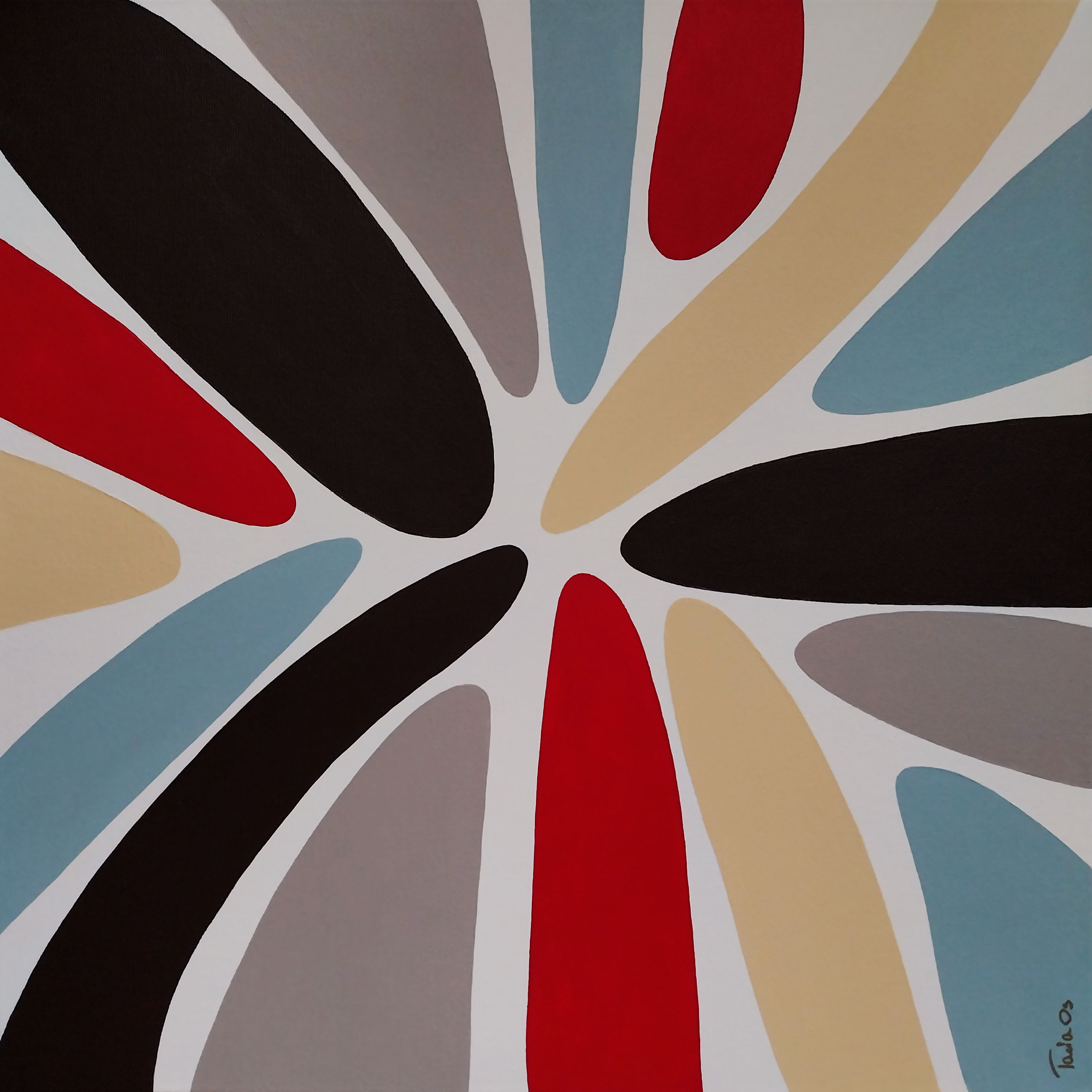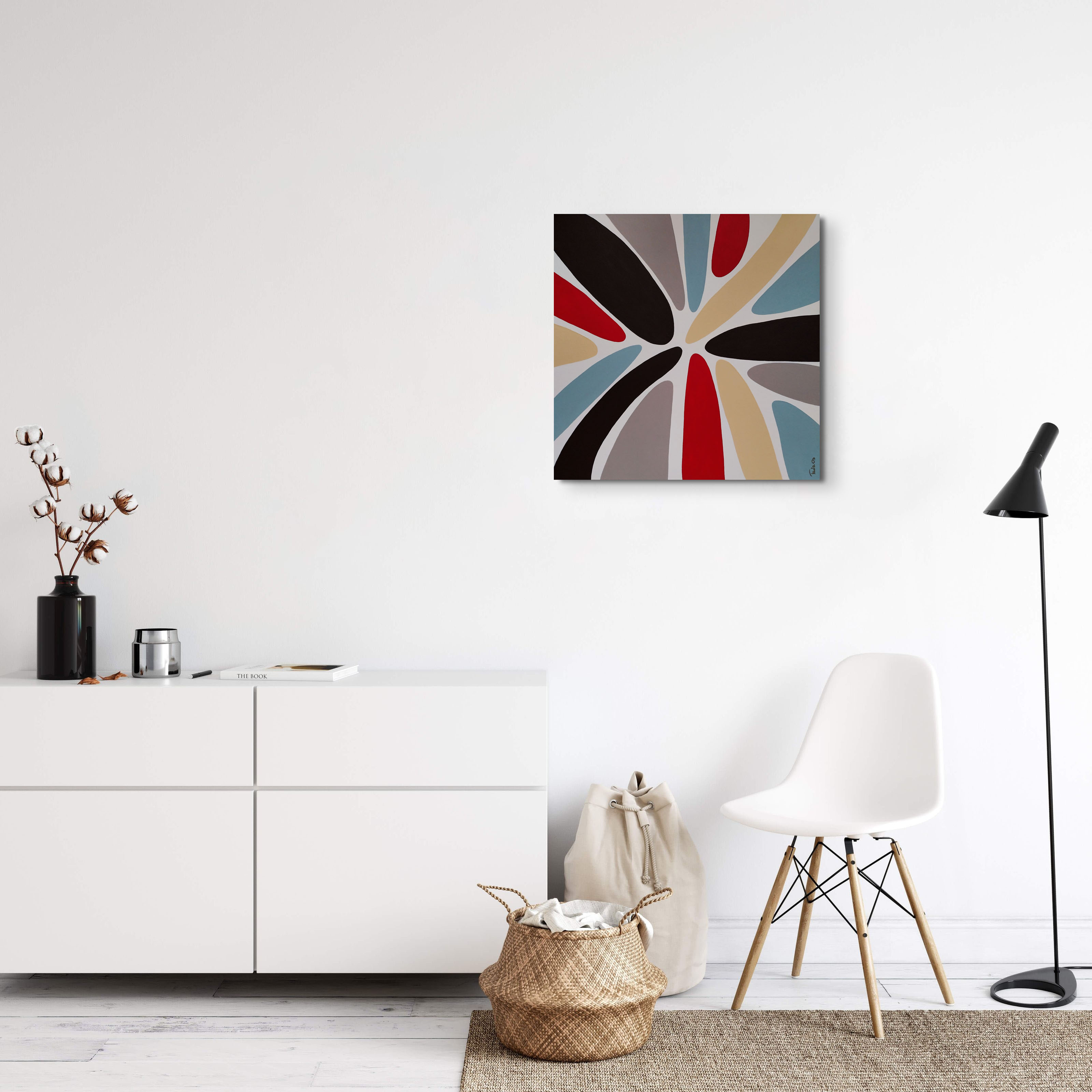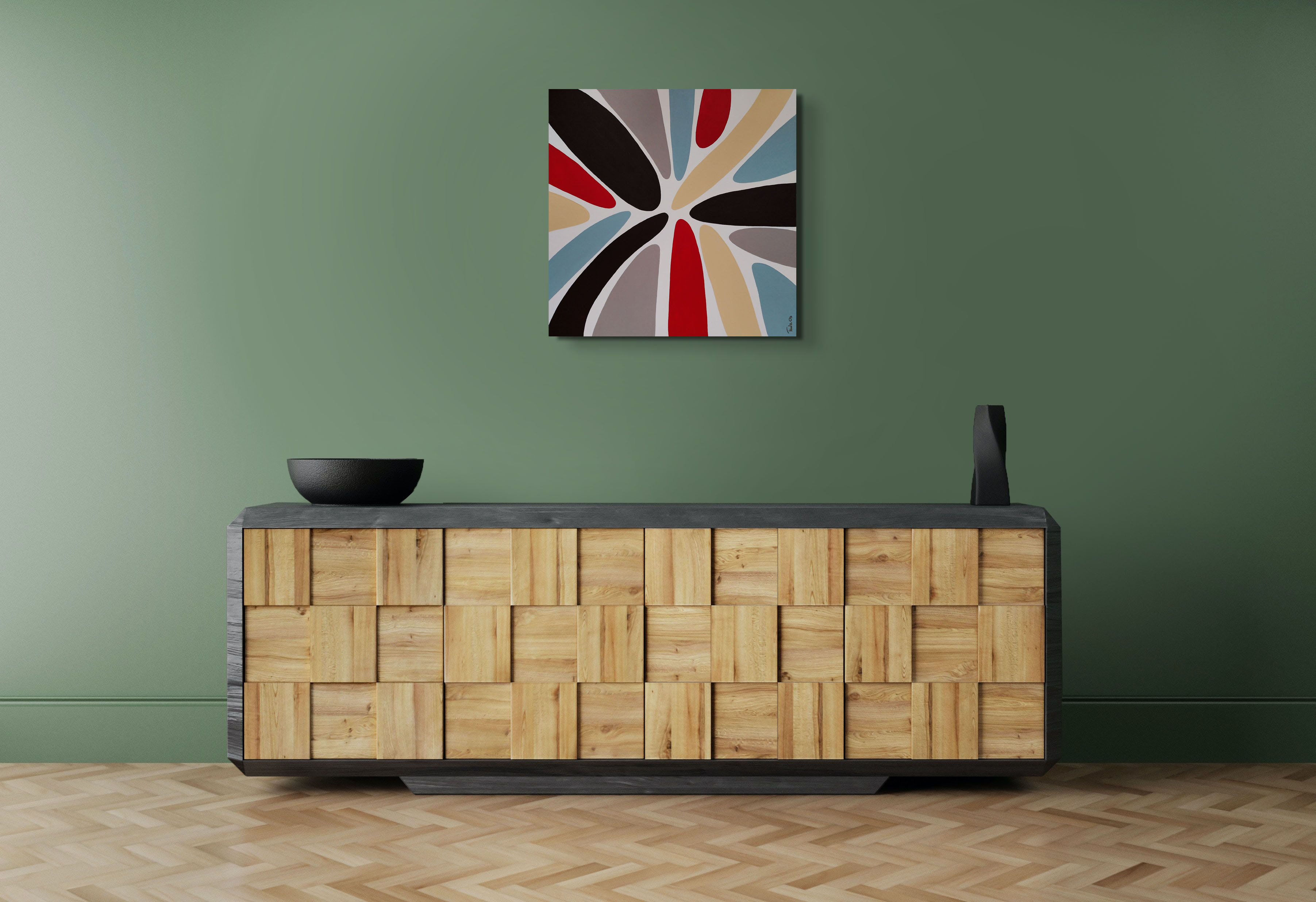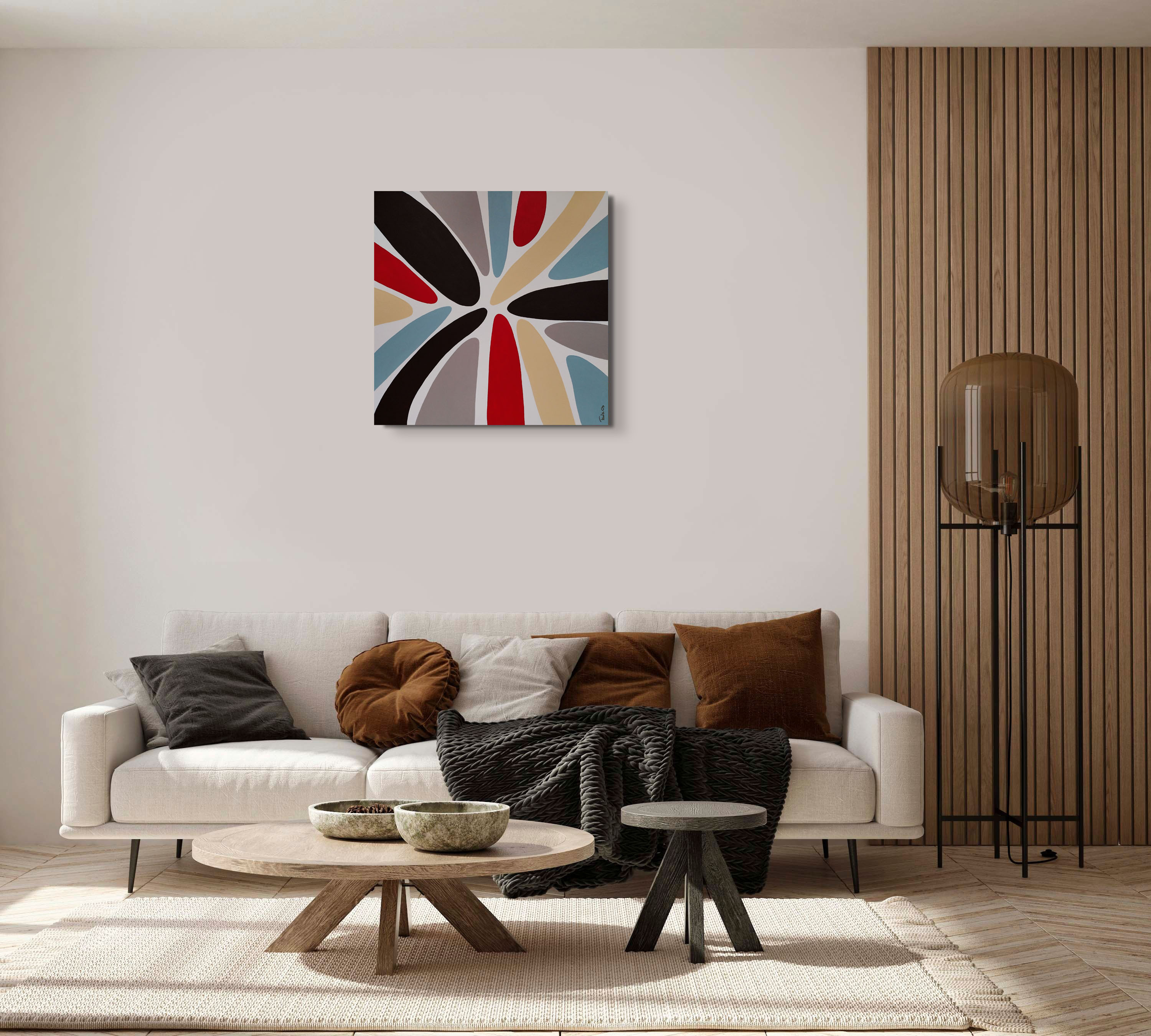 Kolorowa abstrakcja w stonowanych barwach natury i ziemi. Obraz ma pomalowane boki, więc może być powieszony bez ramy.