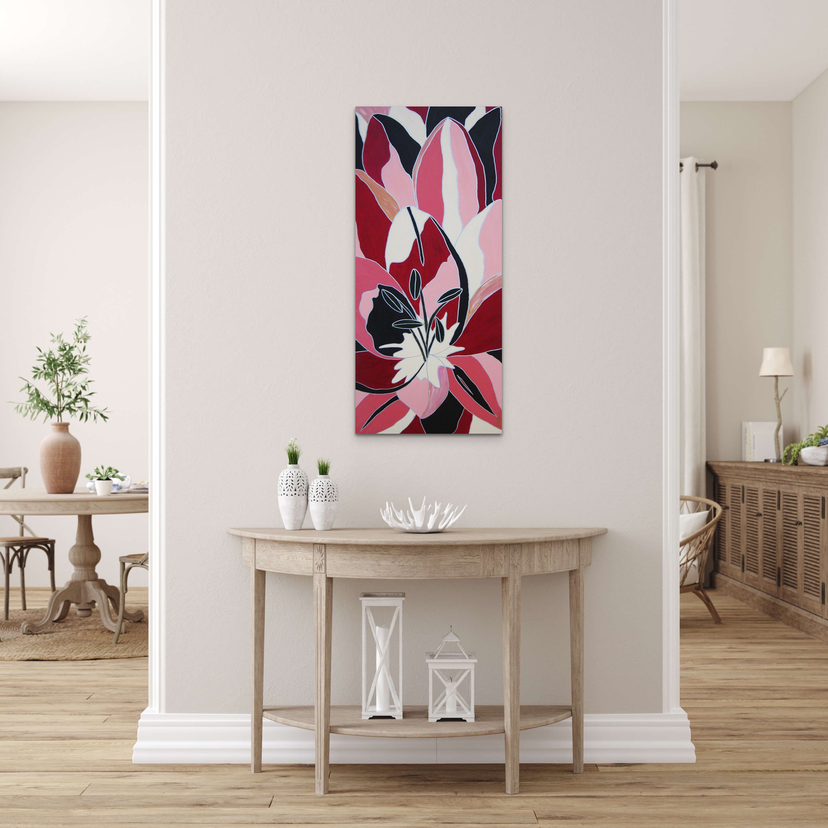 Sztuczna inteligencja napisała o tym obrazie, że może być doskonałym towarzyszem w nudny dzień, przypominając, że świat jest pełen kolorów. Myślę, że coś w tym faktycznie jest, bo obraz jest wyrazisty i pełen energii. Dodałabym jednak, że nie tylko w nudny dzień, ale i we wszystkie szare dni, kiedy pogoda niedopisuje. Obraz wykonany jest w nowoczesnym stylu przypominającym witraż. Ma zamalowane boki, więc rama nie jest wymagana.