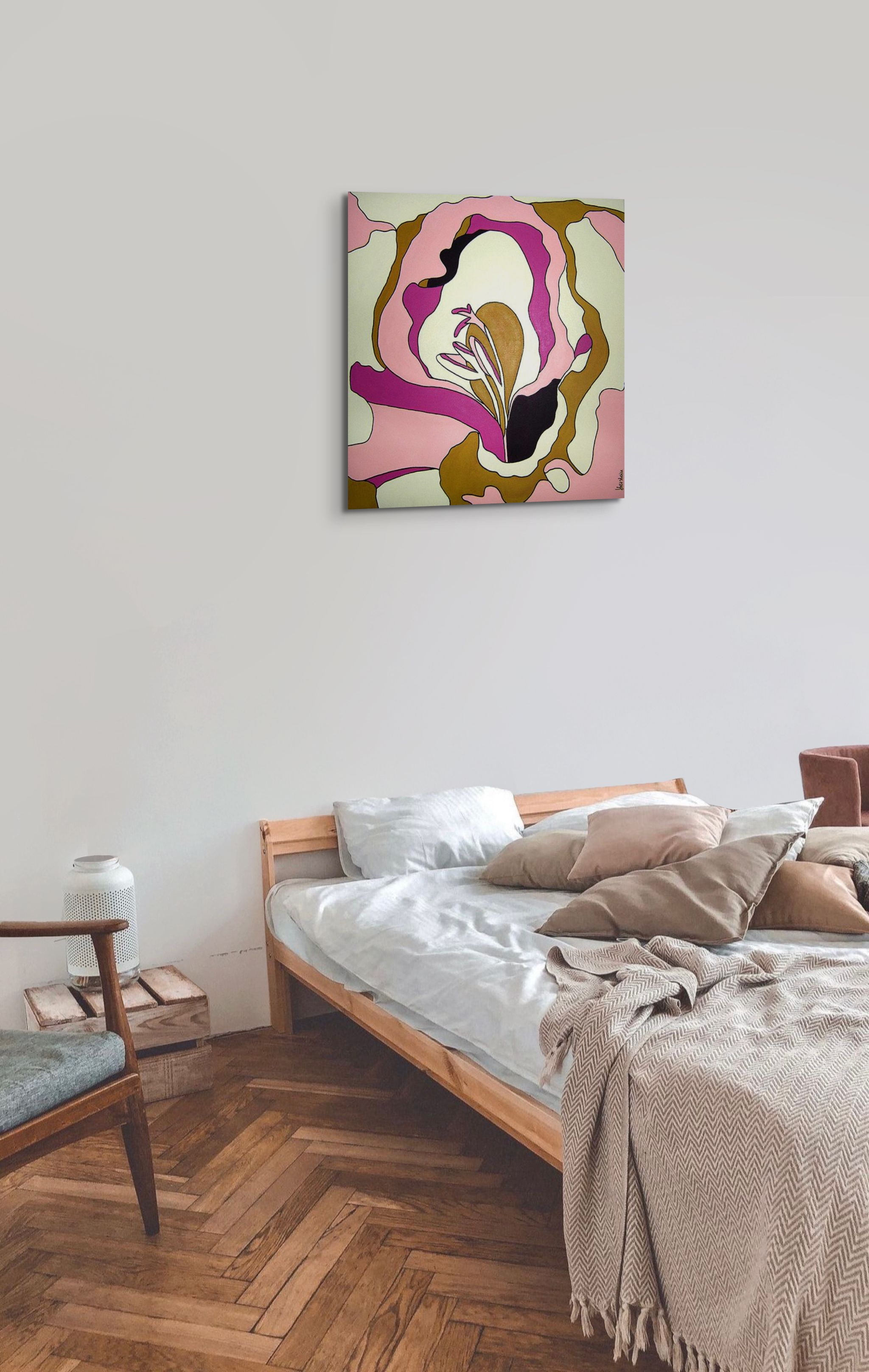 Nowoczesna abstrakcja ukazująca wnętrze kwiatu. Ten delikatny w kolorach obraz jest równocześnie pełen energii. Wykonany jest w stylu przypominającym witraż. Obraz ma zamalowane boki, więc rama nie jest wymagana.