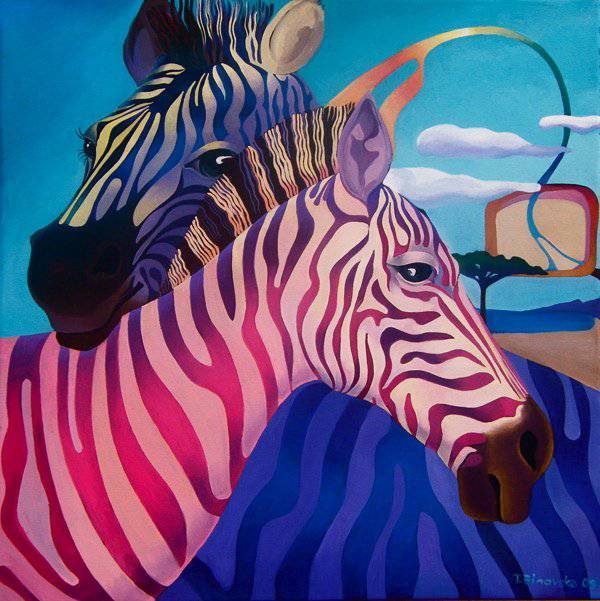 Na tym obrazie dwie zebry przyciągają wzrok swoją niecodzienną kolorystyką. Pierwsza z nich, w odcieniach różu i fioletu, wydaje się niemal tańczyć w jasnych promieniach słońca. Druga, klasyczna czarno-biała zebra, kontrastuje z pierwszą, przez co kompozycja nabiera dynamiki. Kolory są żywe, może trochę szalone, co dodaje obrazowi energii oraz radości. Dominują błękity, róże i fiolety, które nadają pracy surrealistycznego klimatu. Atmosfera jest pełna spokoju, ale z nutką tajemnicy. Zdaje się, że zebry rozmawiają w swoim własnym „zebrzym” języku. Artysta wykorzystał technikę malarstwa olejnego, co nadaje głębię kolorom i tworzy efekt trójwymiarowości. Czy to magia czy zwykły dzień w świecie wyobraźni? Odbiorca może poczuć ciekawość i zachwyt, patrząc na te niezwykłe zwierzęta. Ja widząc to myślę, że taki widok może rozweselić najgorszy dzień. To jest jak “wow”. Nawet małe dziecko powiedziałoby: "To jest śmiesznie fajne!". W różnych miejscach obrazu różni się styl – od realistycznych kształtów do abstrakcyjnych tła. Artysta zastosował elementy zarówno rozpoznawalne, jak i te bardziej abstrakcyjne. Ta sztuka zachęca do zatrzymania się na chwilę i zastanowienia, co właściwie widzimy.