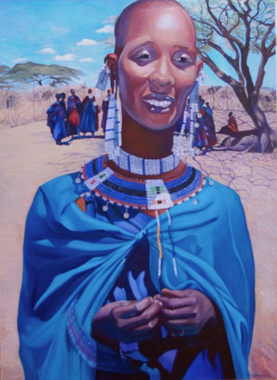 Na obrazie widać postać kobiety, odzianą w intensywnie niebieski strój, który przyciąga wzrok i nadaje scenie magicznego uroku. Jej twarz jest pełna radości i spokoju, a delikatne koraliki zdobiące szyję błyszczą w słońcu. Tło to rozległa, jasna ziemia i nietypowe drzewa, co dodaje obrazowi wrażenie ciepłego popołudnia. W oddali kilka osób tworzy subtelne cienie, a ich sylwetki są owinięte w podobne, kolorowe tkaniny. Atmosfera obrazu jest radosna i pełna życia. Czuć w niej harmonię natury i ludzkiego bytu. Styl malunku jest realistyczny, ale ma w sobie nutę malarskiego impresjonizmu, zwłaszcza w sposobie przedstawienia światła i cieni. Artysta z powodzeniem uchwycił moment czystego szczęścia i ulotnego piękna. Emocje, które budzi ten obraz, obejmują podziw dla prostoty i piękna codziennego życia. Przywołuje na myśl spokój i jedność z naturą. "Wow, ale super kolory!" - to mogłoby być coś, co powie dziecko, widząc tę scenę. A mnie osobiście obraz zachęca do refleksji nad tym, jak piękno może tkwić w najmniejszych szczegółach. Jej uśmiech mówi więcej niż tysiąc słów. Życie potrafi naprawdę być "amazing" w swej prostocie.