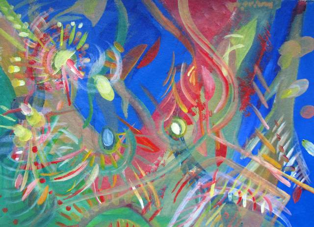Obraz wiruje pełnią barw - niebieski tło zdaje się być głębokim oceanem, w którym zanurzają się różnokolorowe kształty. Jest tu zieleń, czerwień, trochę żółci i różu - razem tworzą feerię, która niemal tańczy przed oczami. Kompozycja jest dynamiczna, a splątane linie i kształty wręcz pulsują energią. Na pierwszy rzut oka może się wydawać chaotyczny, ale im dłużej się patrzy, tym bardziej wciąga. To, co od razu uderza, to radosny, pełen życia nastrój. Jest w tym coś ulotnego, co kojarzy się z zabawą i beztroską letniego dnia. Artysta posłużył się techniką, która przypomina akwarelę, z miękkimi przejściami między kolorami, ale wyraziście zaznaczonymi konturami. No naprawdę, coś innego. Może to olej? Who knows. Dzieło to może wywoływać szeroką gamę emocji u odbiorcy - od euforii po spokój. Kojarzy się z tańcem barw, jakby cała kompozycja była utworem muzycznym przełożonym na obraz. "Ja myślę, że to jest jak tęcza, tylko bardziej!" - powiedziałoby dziecko. Warto po prostu dać się ponieść tej plątaninie barw i form. Tutaj wszystko zdaje się żyć własnym, nieograniczonym życiem. To sztuka, która budzi nie tylko zmysły, ale i wyobraźnię.