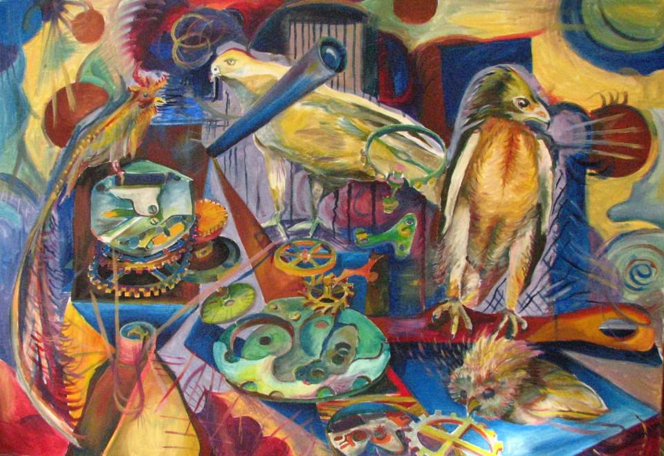 Na obrazie dominuje kalejdoskop kolorów: od ciepłych żółci i czerwieni po chłodne błękity i zielenie. To istna eksplozja barw! Centralnym elementem są ptaki, które zdają się unosić w surrealistycznej przestrzeni pełnej zębatek i dziwnych przedmiotów. Kompozycja jest dynamiczna, a linie i kształty przenikają się ze sobą, tworząc magiczny chaos, który jednak ma w sobie coś harmonijnego. Atmosfera obrazu jest zaskakująco hipnotyzująca, niemal jakby chciała wciągnąć odbiorcę do swojego świata. Styl artysty jest nieco abstrakcyjny, z wpływami surrealizmu. Widać śmiałość pędzla, odważne kontrasty i drobiazgowe detale ukryte w postaciach ptaków i mechanicznych elementach. Całość zdaje się opowiadać historię o współdziałaniu natury i techniki, co prowokuje do refleksji. Patrzę na to i myślę: wow, co autor miał na myśli? Może to obraz o tym, jak świat ludzi i zwierząt kiedyś się połączy w harmonii. Dla mnie, ta praca to mix emocji - od zagubienia do zachwytu. To jest naprawdę 'mind-blowing'. Uwielbiam, jak różne elementy zdają się krzyczeć o uwagę, a jednocześnie budują coś wspólnego. "Hej, ptaszki są fajne!" - powiedziałoby dziecko na widok tego obrazu.