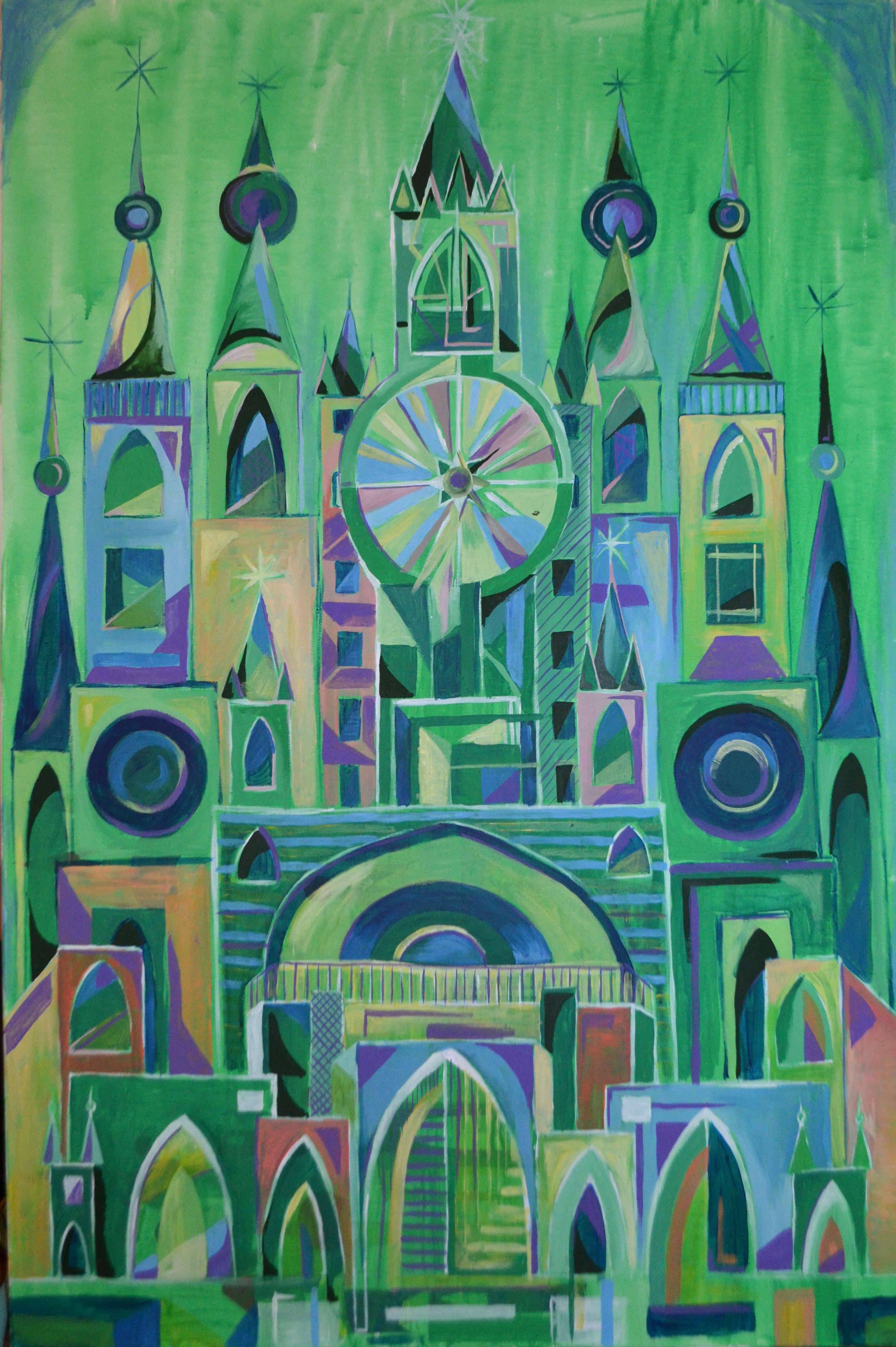 Obraz jest niezwykle barwny, dominują tu odcienie zieleni, fioletu i błękitu, które łączą się w harmonijną mozaikę kształtów. Strzeliste wieże wydają się grą geometrycznych form, a centralne koło przypomina wielkie, magiczne oko. Całość kojarzy się z baśniowym zamkiem, jakby wyrwanym z kart fantastycznej opowieści. Atmosfera jest pełna tajemniczości i lekkości, trochę jak senne marzenie. Artystyczny styl przypomina kubizm, choć z nutką impresjonizmu. Artysta zdaje się bawić formą i kolorem, a użyta technika akwareli dodaje transparentności i eteryczności kompozycji. Odbiorca może poczuć się zagubiony w labiryncie form, jednocześnie zachwycony wizją tego magicznego miejsca. Myślę, że każdy patrzący na obraz ma swoje własne, indywidualne „interpretation” tego dzieła. A wiesz, to wygląda jak magiczny zamek z bajki! Jest w tym coś, co przypomina mi dzieciństwo, te chwile, kiedy wszystko było możliwe i niesamowite. Obraz nie tylko cieszy oko, ale sprawia, że serce zaczyna szybciej bić z ekscytacji.