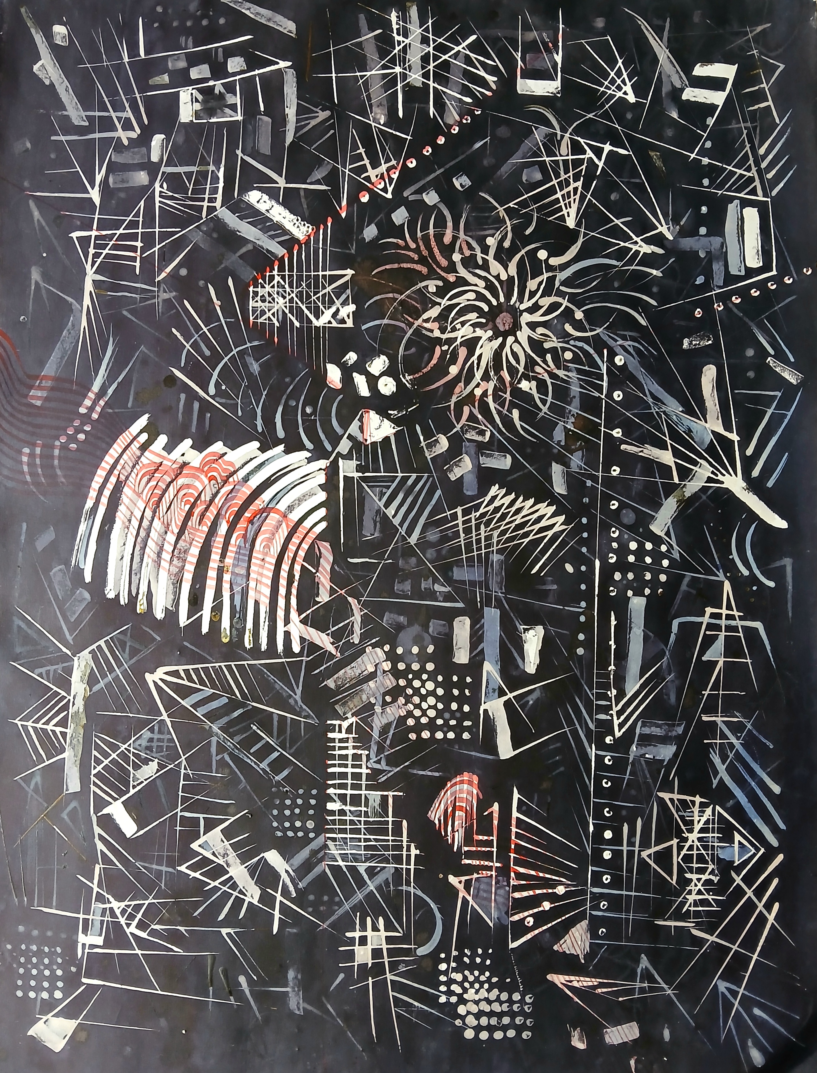 Obraz, który mamy przed oczami, to prawdziwe arcydzieło chaosu. Na czarnym tle snują się białe i czerwone linie oraz kształty, które przypominają mi pajęczą sieć. Artysta postanowił zaprosić nas do labiryntu geometrycznych wzorów. Kolory ograniczone do czerni, bieli i odrobiny czerwieni tworzą mocny kontrast, a każda linia zdaje się tańczyć w swoim własnym rytmie. Atmosfera tego obrazu jest dynamiczna, niemal elektryczna – bije z niego energia, jakby miał własne życie. To abstrakcyjna eksplozja, która skłania do zastanowienia. Styl jest nowoczesny, z wyraźną skłonnością do geometrycznych figur i symetrii, które miejscami przełamuje swobodny ruch linii. Patrząc na to dzieło, czuję niepokój, ale i fascynację – jakby odkrywać tajemnicę ukrytą w zawirowaniach kształtów. Niektórym może przypominać misterne zawiłości technologii lub mechanizmów. Dla mnie, to jak zawirowania emocji, niespokojne myśli, które próbują znaleźć wyjście z labiryntu. I wiecie co? Chciałbym się w nim zgubić. W środku obrazu wygląda to trochę jak galaktyka, myślę, że artysta bawił się konceptem kosmosu. To fascynujące, jak tak niewiele kolorów może wywołać tyle emocji i pobudzić do myślenia.