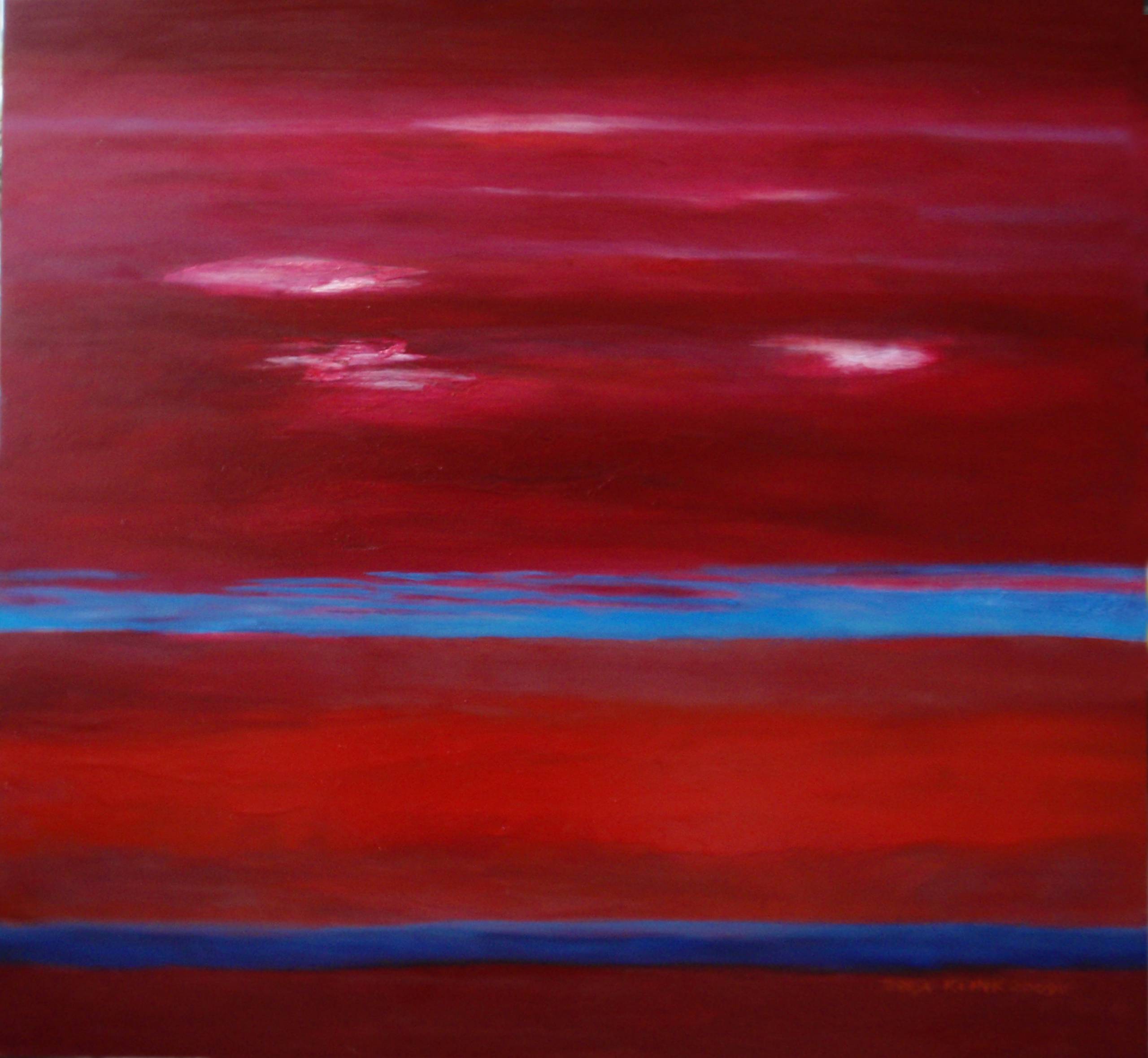 Na obrazie dominują intensywne czerwienie i błękity, które tworzą dynamiczny kontrast. Przestrzenne linie i plamy kolorów zdają się falować, oddając emocję jakiegoś krawędzi dnia. Kompozycja jest raczej horyzontalna, z różnymi odcieniami czerwieni u góry i dołu, przedzielona pasem niebieskiego, jakby to był horyzont nad morzem. Atmosfera dzieła jest pełna energii, niemalże elektryzująca. Czujesz, jakbyś stał na skraju czegoś wielkiego. Artystycznie, ten obraz przypomina styl abstrakcyjny, gdzie artysta posługuje się grubymi pędzlami i techniką impasto, nadając całości strukturalnej głębi. "Wow, ale to dużo czerwonego!" - powiedziałoby dziecko patrzące na ten obraz. Emocjonalnie, obraz przywołuje uczucie napięcia, ale i nadziei. Może symbolizować zmiany, które są na horyzoncie. Struktura sztuki wygląda na spontaniczną, choć dobrze przemyślaną. Kolorowy chaos, który jednocześnie koi i pobudza. It's breathtaking! To obraz, który emanuje ciepłem i pewną niewyjaśnioną tajemnicą, ukazując, jak kolor może poruszać serce.