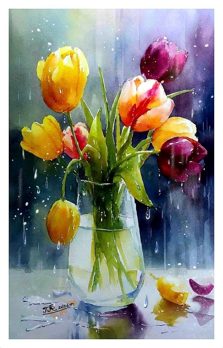 Obraz nosi tytuł "Efemeryczność" . Jest to akwarela namalowana w 2026 roku. Przedstawia martwą naturę – bukiet różnokolorowych tulipanów w szklanym wazonie, umieszczony w ogrodowej scenerii podczas deszczu. Autorką obrazu jest art. plastyk, malarz Teresa Kopańska. Artystka pasjonuje się symboliką, co często odzwierciedlają jej obrazy i tu w tej akwareli kwiaty tulipanów symbolizuję tytuł pracy - Efemeryczność Praca na papierze akwarelowym firmy canson. Do malowania użyto najlepszych farb akwarelowych firmy "Białe noce" oraz kredą akwarelową. Wymiary: bez oprawy A 4 cm. Praca posiada sygnaturę z datą wykonania. Akwarelę "Efemeryczność" - kupisz w oprawie - Passepartout